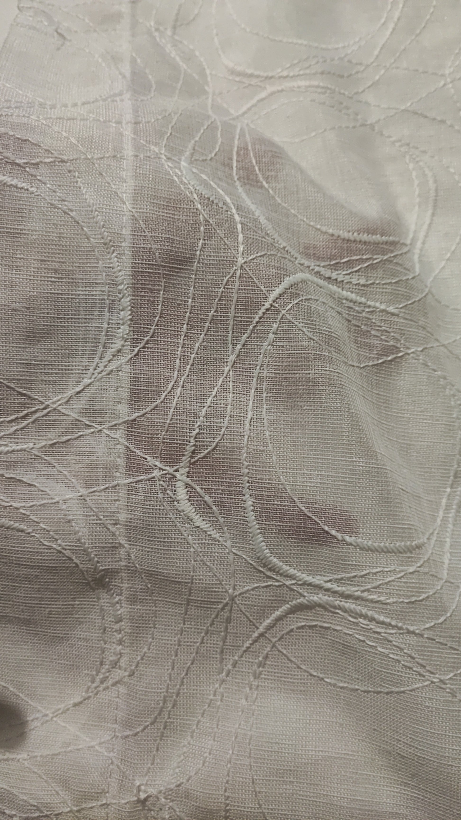 Tendina produzione italiana, ricamata in rilievo bianca su bianco.La tendina è larga 60 cm.