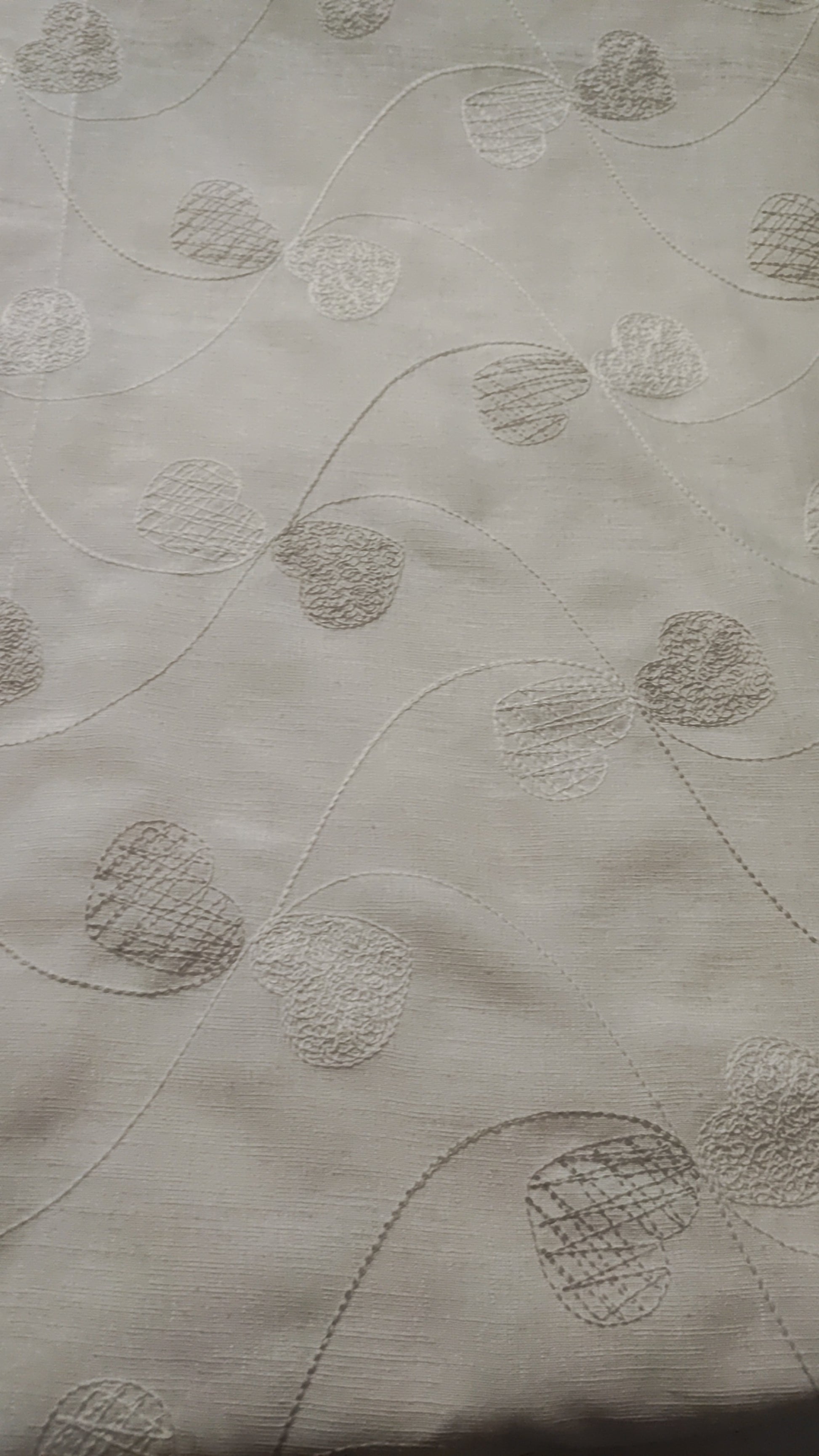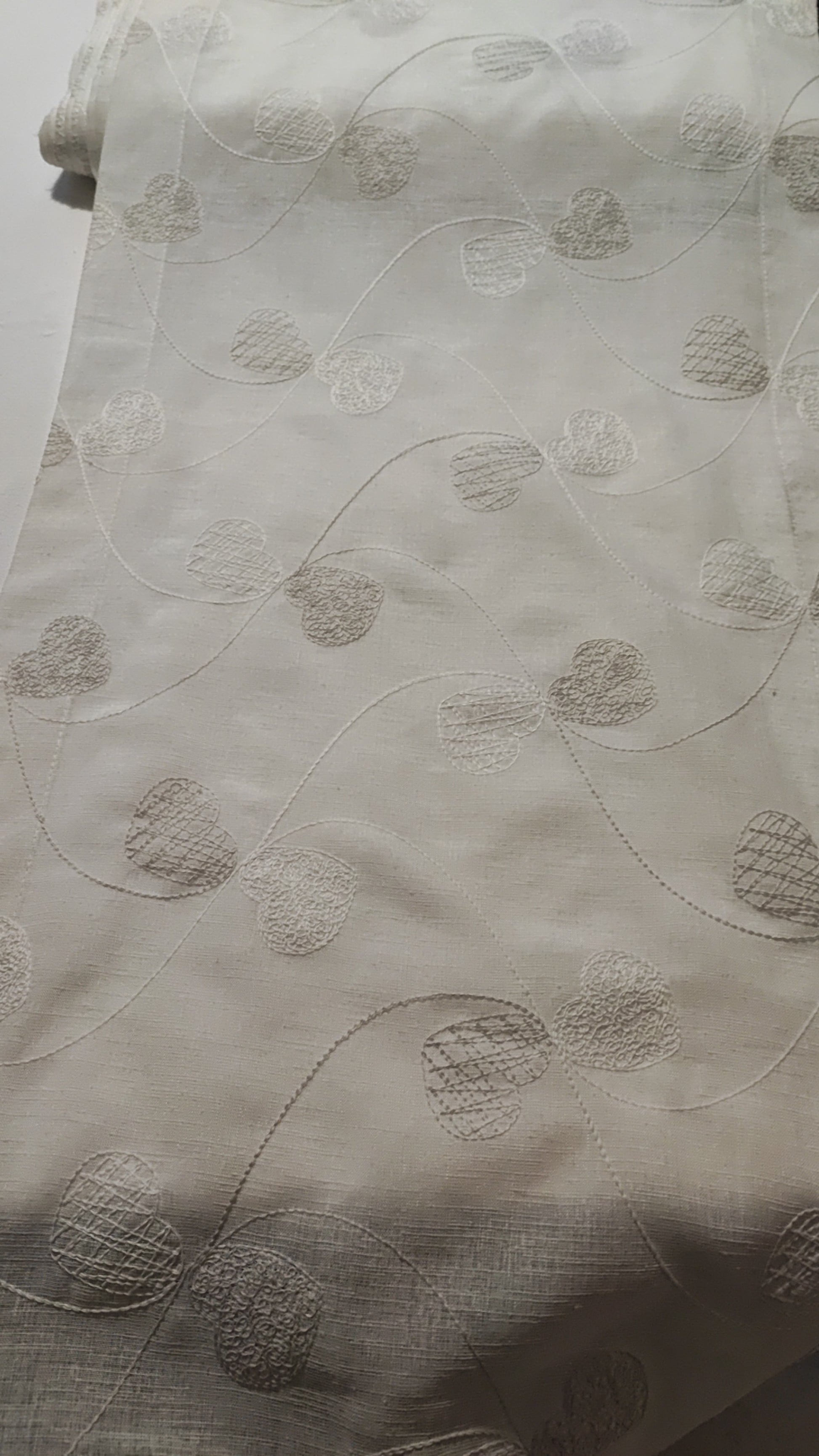 Tendina con ricamo in rilievo disegno con cuori, colore tortora/bianco larga 60 cm già confezionata e a metraggio disegnata e prodotta in Italia.