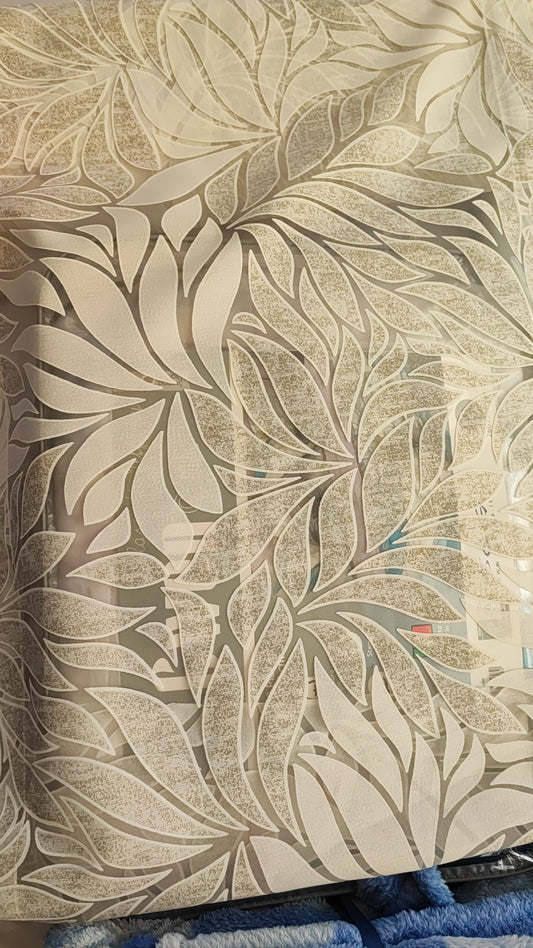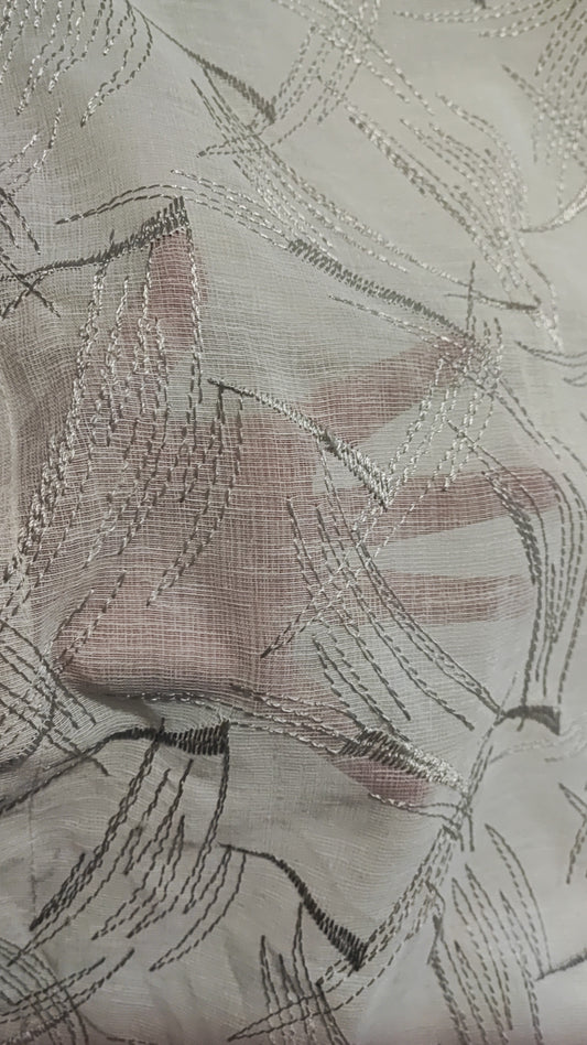 Glass curtain embroidered with waves in white, grey, beige and blue