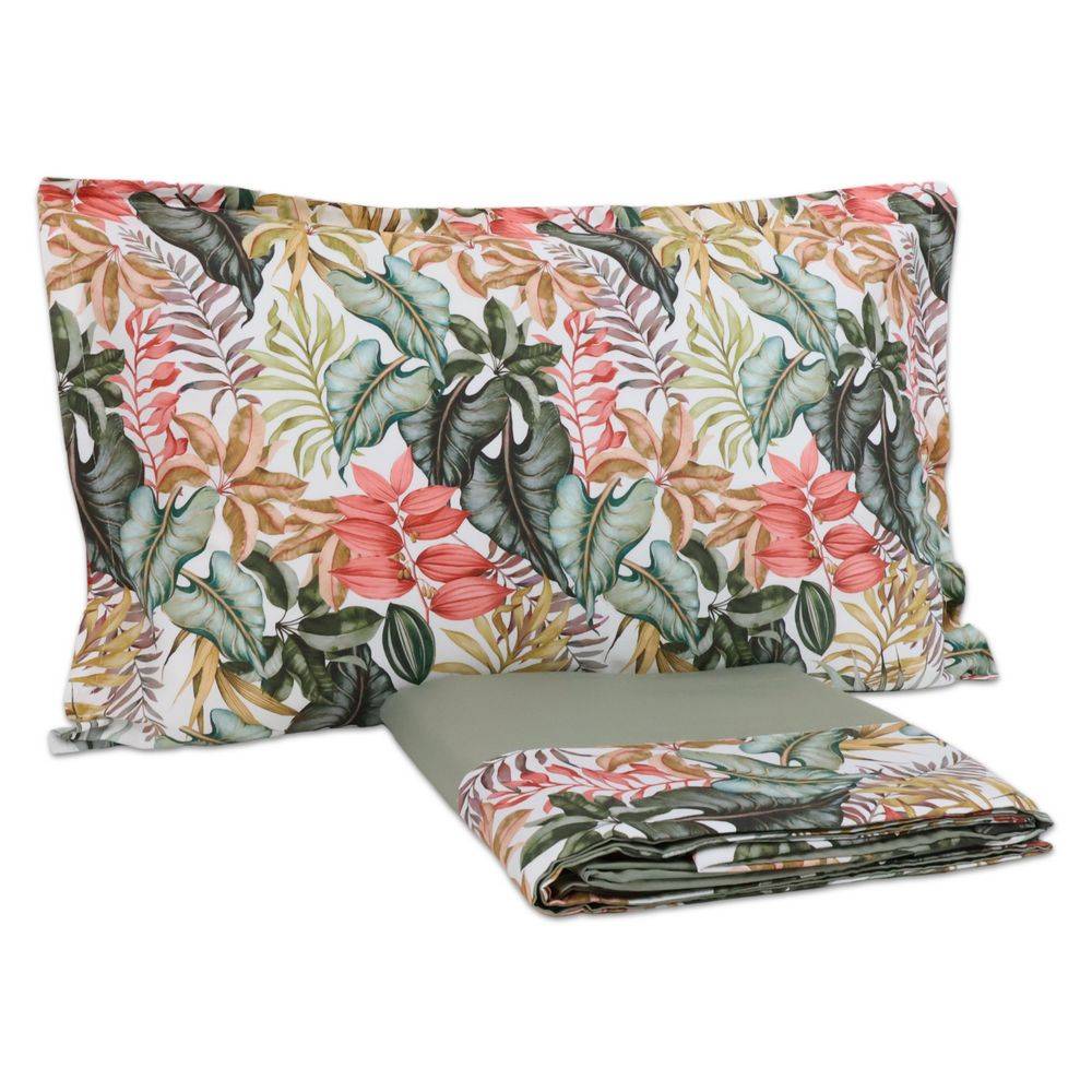 Completo Lenzuola CREOLE con Balza Viviane Verde Matrimoniale è la scelta ideale per chi desidera una camera elegante, fresca e ricercata, con una qualità tessile superiore e un’estetica distintiva. La fantasia Viviane nella variante Verde si caratterizza per un raffinato intreccio di ampie foglie tropicali, palme stilizzate e dettagli botanici che si sviluppano su fondo chiaro, con sfumature che spaziano dal verde salvia all’ottanio, arricchite da accenti caldi senape e delicati tocchi corallo. Il risultato è un insieme armonioso, scenografico ma equilibrato, perfetto per valorizzare sia ambienti moderni sia camere più classiche.
