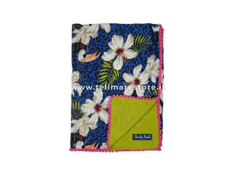Kikoy Copacabana Toalla Tucanes con Pon Pons, medida verde trasera 90x170 cm, tejido superior 100% Algodón Estampado, tejido inferior Microesponja 100% Poliéster, Toalla de Playa - Toalla Pareo Doble.