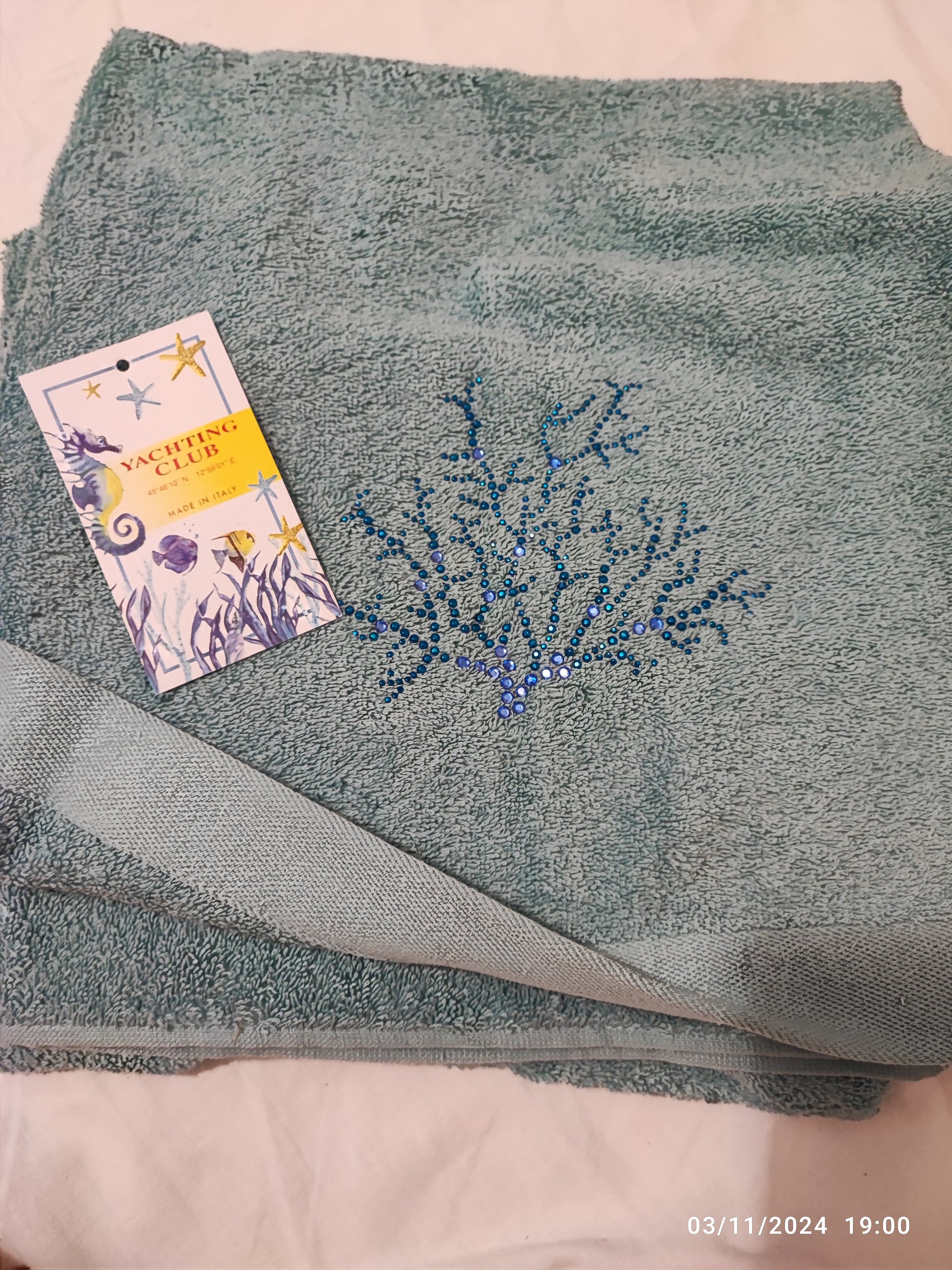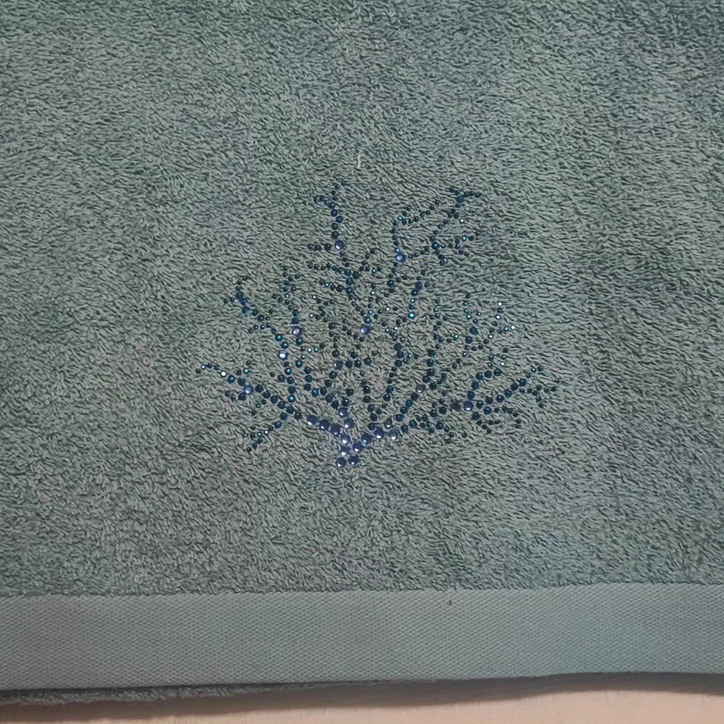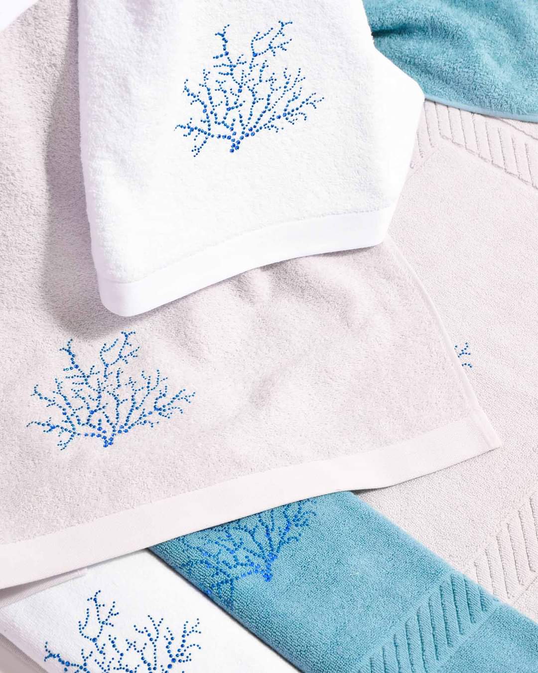 Coppia di asciugamani mani più viso con ricamo corallo in rilievo con applicazione Swarovski ottima grammatura, disegnato e progettato in Italia della Yachting club.