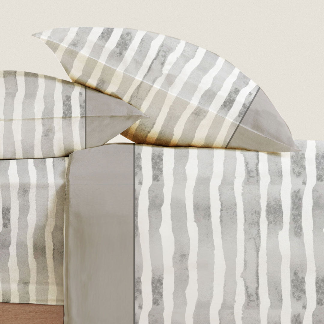Completo lenzuola copriletto Zoya, realizzato in 100% cotone. Il set è composto da lenzuolo superiore maxi con la fantasia , lenzuolo con angoli con la stampa a righe e coppia di federe double-face con la stampa a righe.