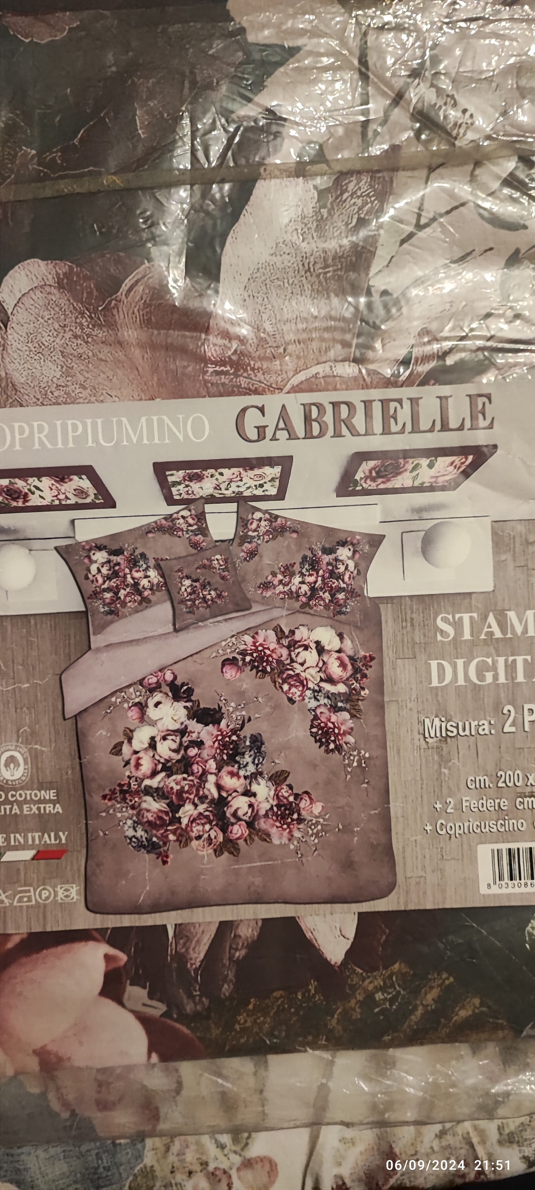 Copripiumino Gabrielle, matrimoniale, misura 200x250, due federe 50x80, più copricuscino 40x40, stampa digitale , puro cotone qualità extra fibra naturale , disegnato e progettato in Italia.