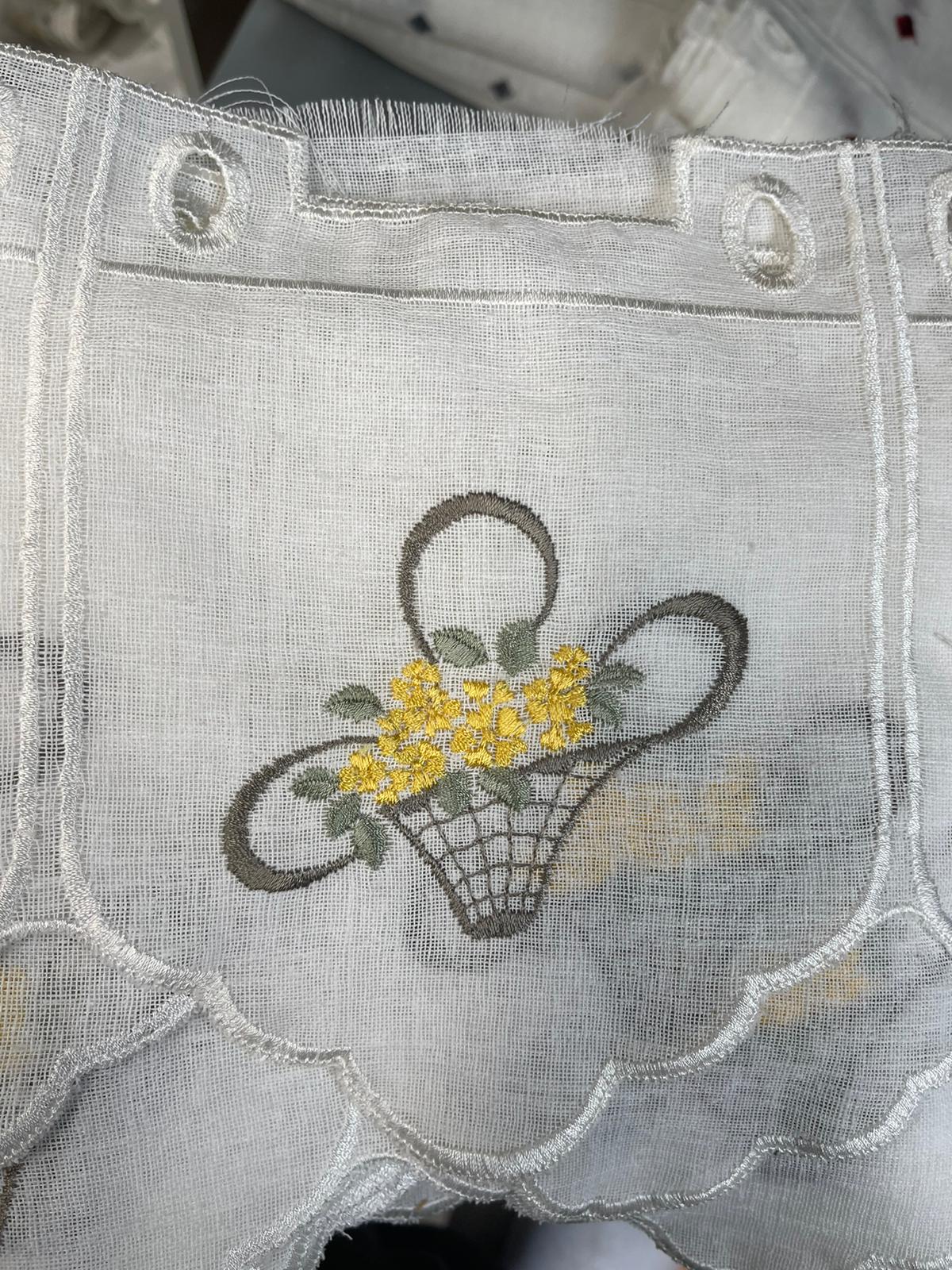 Mantovanina ricamata in rilievo con cestino di fiori gialli, tessuto di misto lino, disegnata, ricamata e progettata in Italia