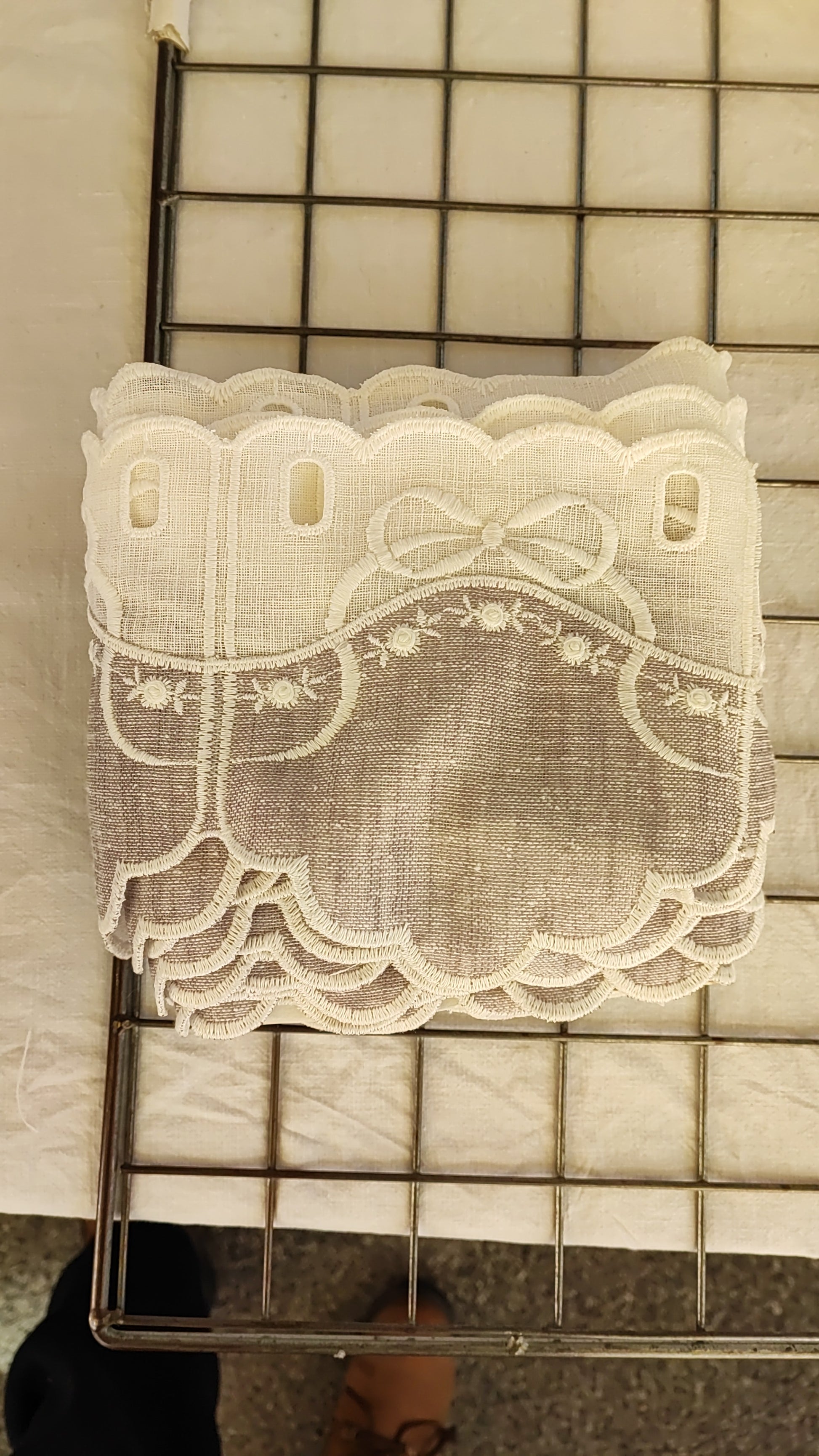 Mantovanina bianca/grigia con fiocco ricamata con fiorellini bianchi, tessuto mistolino, disegnata prodotta in Italia.