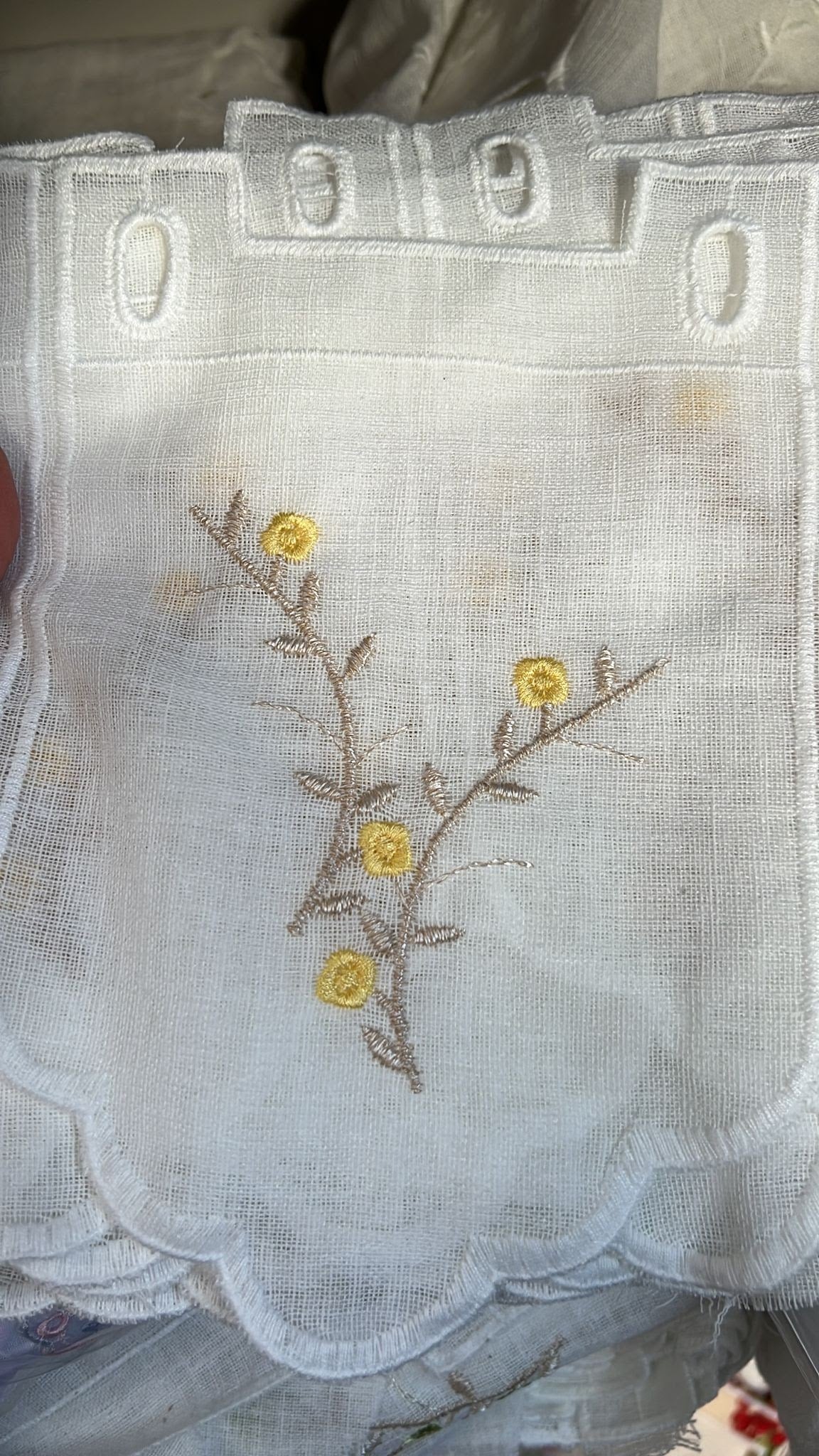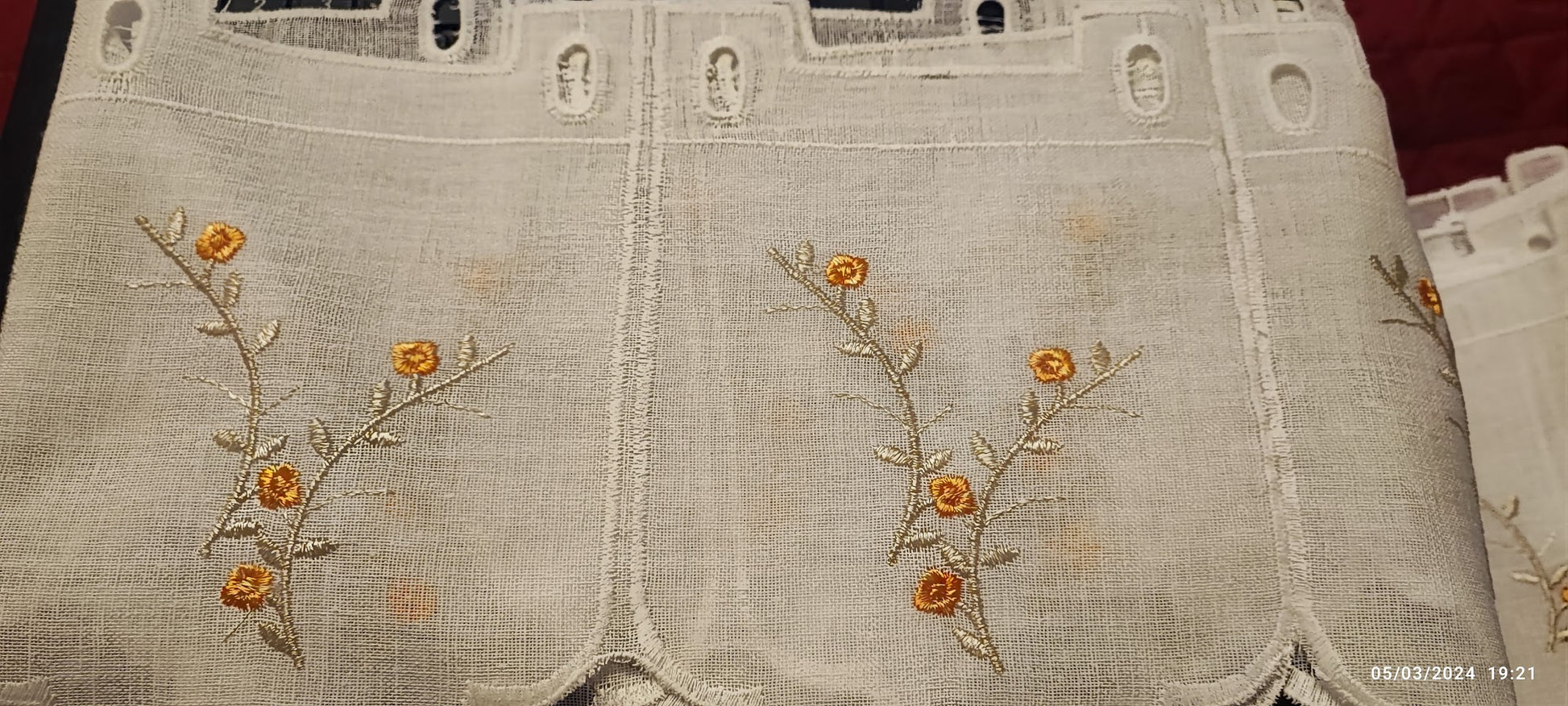 Mantovanina ricamata fiore giallo, e fiore arancio/salmone tessuto mistolino, disegnata prodotta in Italia.