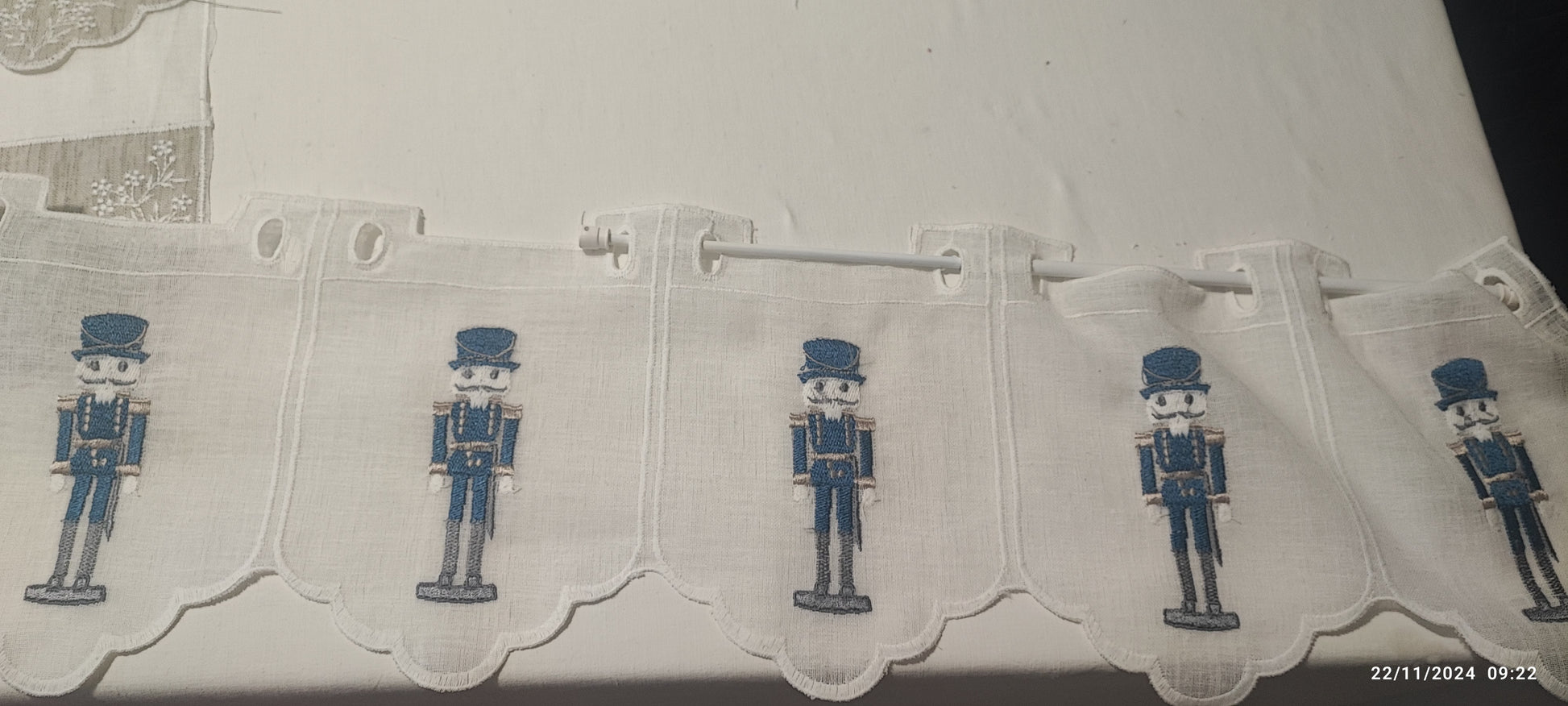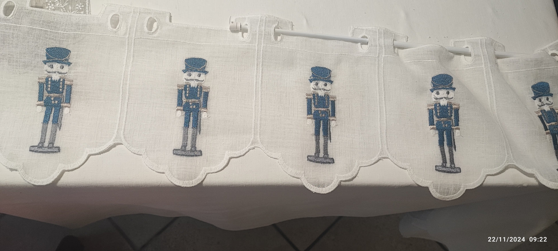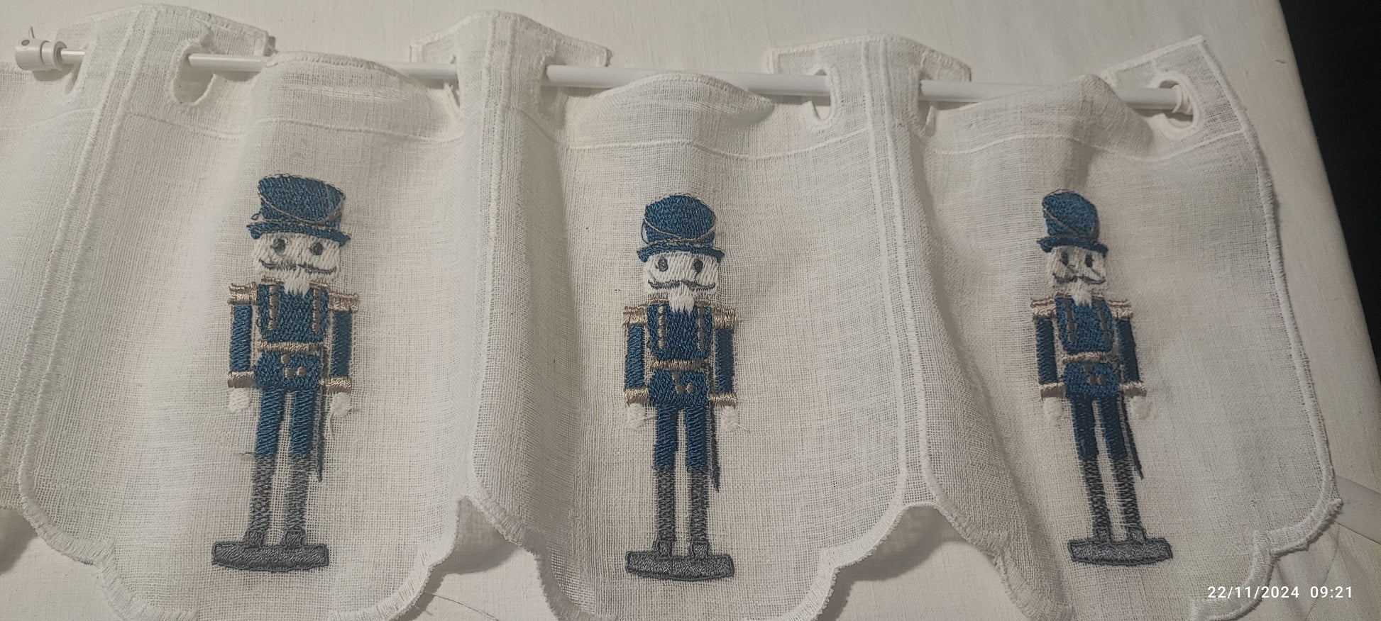 Monttovanina Schiaccianoci ricamata di blu tessuto etoile, progettata e disegnata in Italia, h 23, taglio verticale, si può tagliare ogni 16 cm in larghezza.