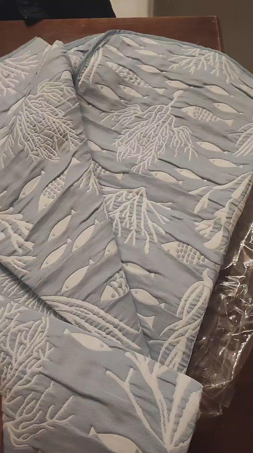 Copriletto Jacquard double/face , positivo, negativo, bordato con sbieco in tinta.Misura matrimoniale 260x260 . da una parte Sky con i coralli e pesci bianchi ricamati e dall'altra parte bianco naturale con coralli e pesci colore Sky.Il copriletto è tutto bordato