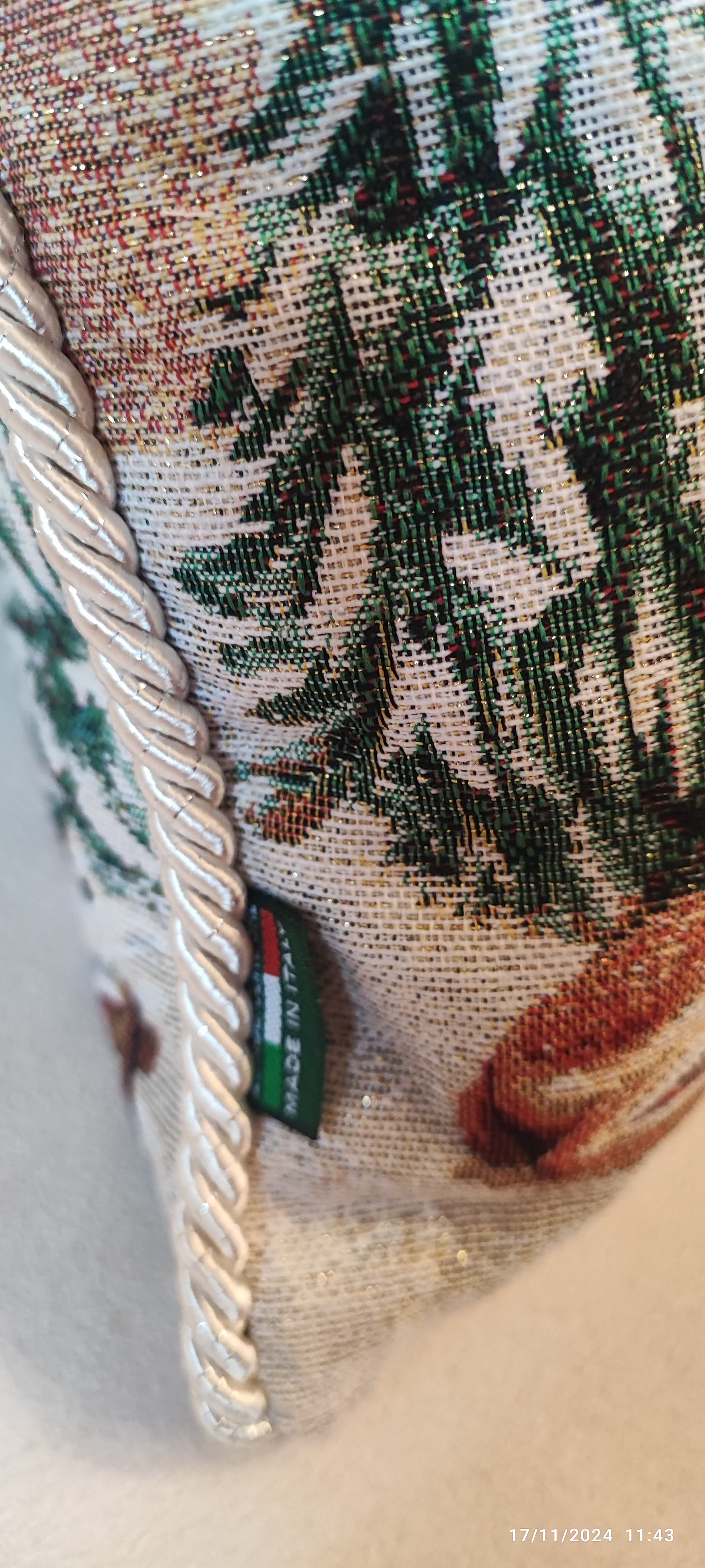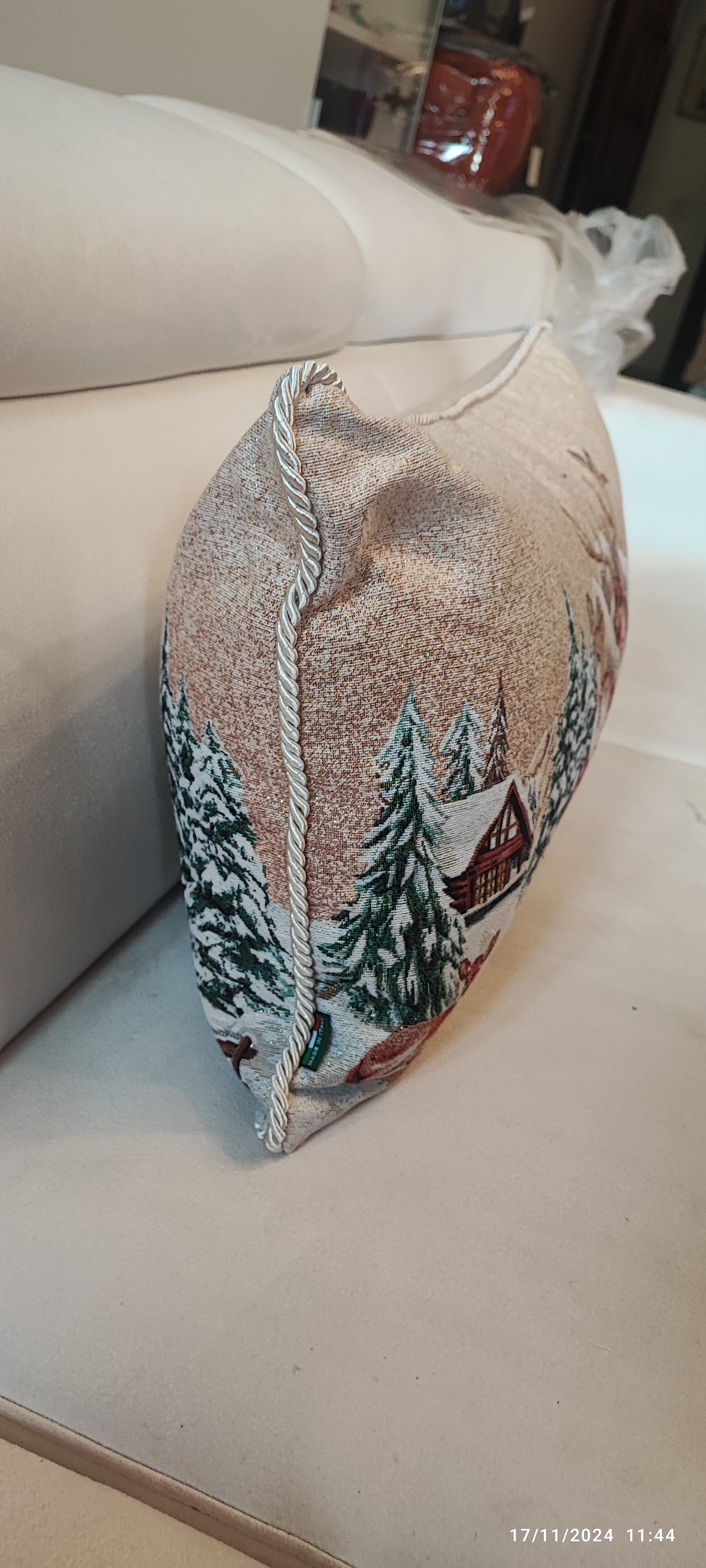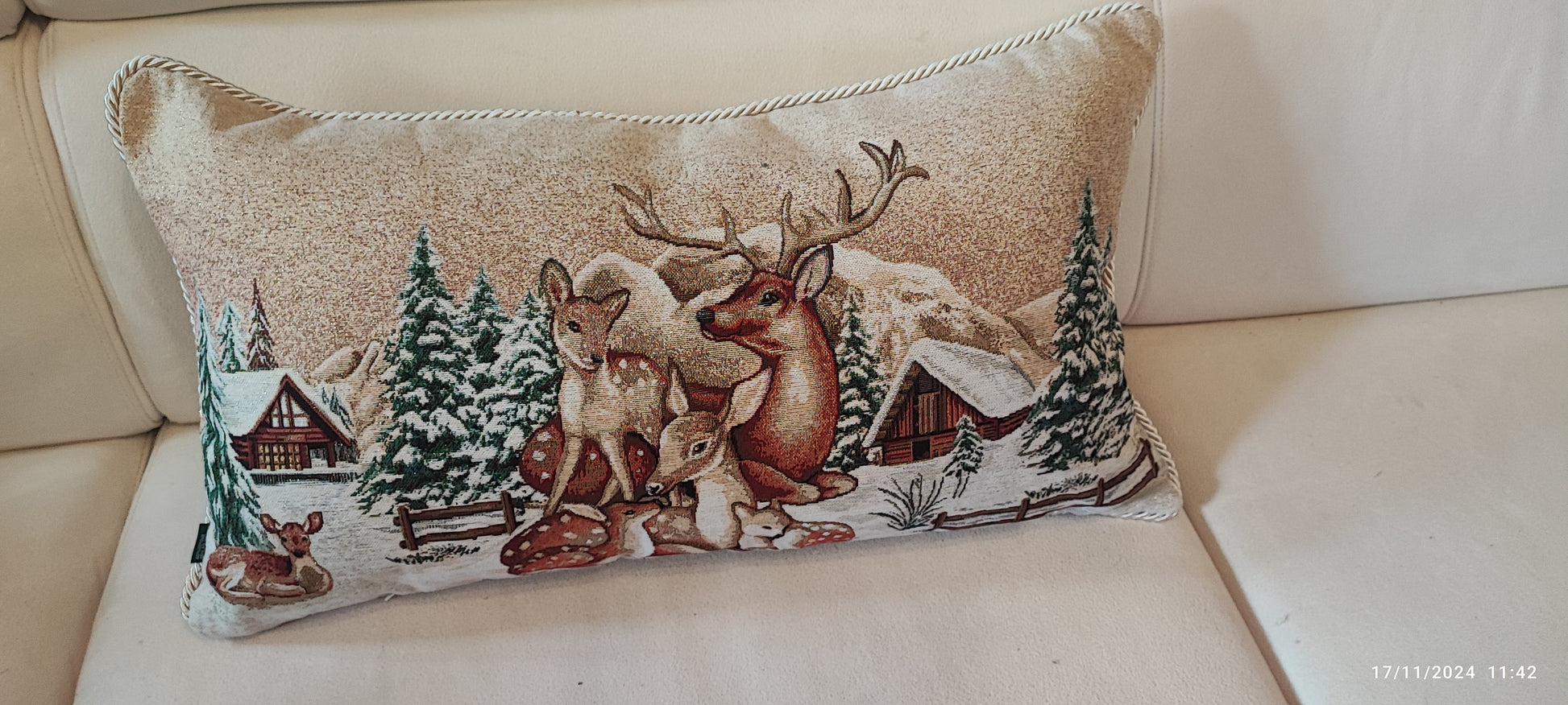 Cuscino in gobelin con lurex disegnato in entrambi i lati con cervo e cerbiatti (Cari') con cordone e cerniera sfoderabile misura 70x35 con interno.