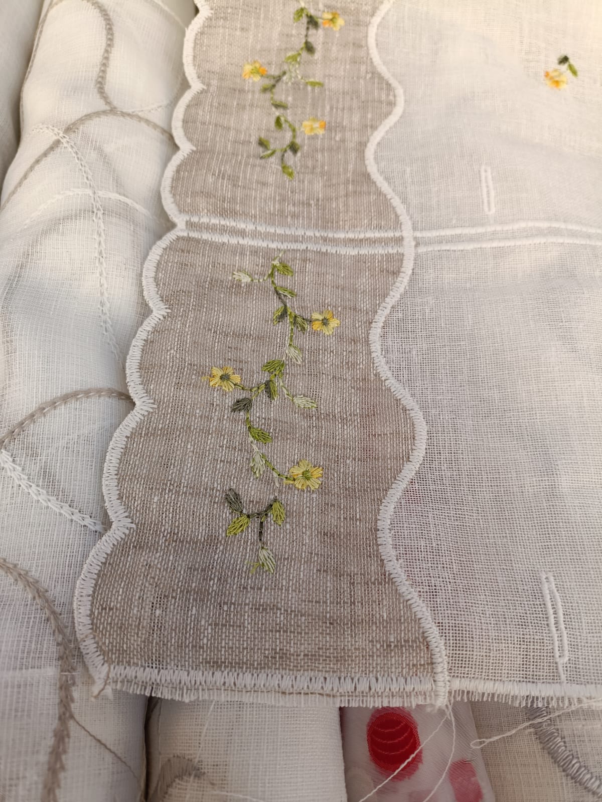 Tendina tessuto misto lino larga 60 cm taglio orizzontale già confezionata ricamata in rilievo con fiorellini, disegnata e prodotta in italia.