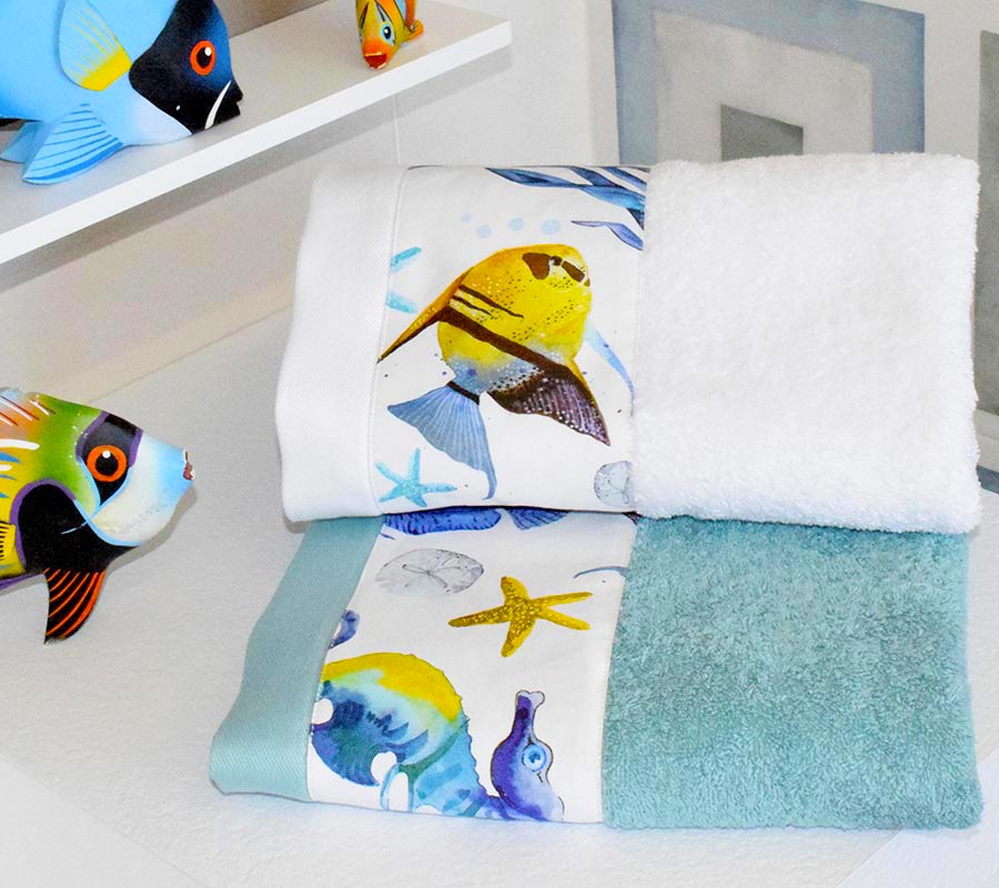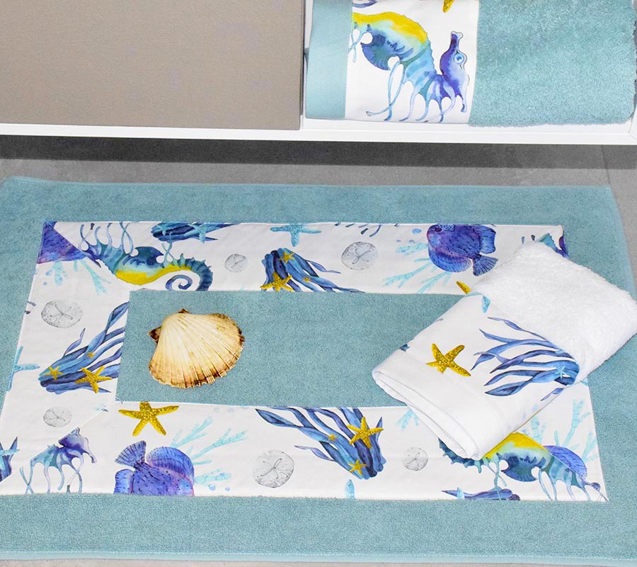 Tappeti in morbidissima spugna di puro cotone con applicazioni e preziosi ricami ispirati al mare, made italy.
