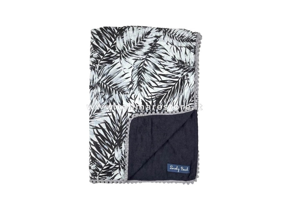 Telo Pareo Kikoy Copacabana Felci misura 90x170 cm, è rifinito su tutti i lati da passamaneria di pon pon. La parte superiore del telo è in 100% Cotone fresco, stampato, mentre la parte inferiore 100% micro spugna in poliestere tinta unita grigio antracite. La stampa nella parte superiore del pareo è rappresentata da tante foglie di felci nei colori grigio e bianco. Il Prodotto è completamente 100% AZO FREE, ecocompatibile e sicuro, ovvero i tessuti non contengono alcuna quantità di coloranti azoici, coloranti che liberano sostanze cancerogene al contatto con il corpo umano. Il Kikoy si può utilizzare al mare come coprilettino, da stendere sulla sabbia, in piscina, da indossare come Pareo o come telo da asciugarsi dopo un tuffo rinfrescante. Fatti avvolgere dal fresco cotone e dai colori vivaci, per essere sempre alla moda con il treend dell'estate. Consigliato anche come regalo utile e alternativo. Lavare a 30° C.