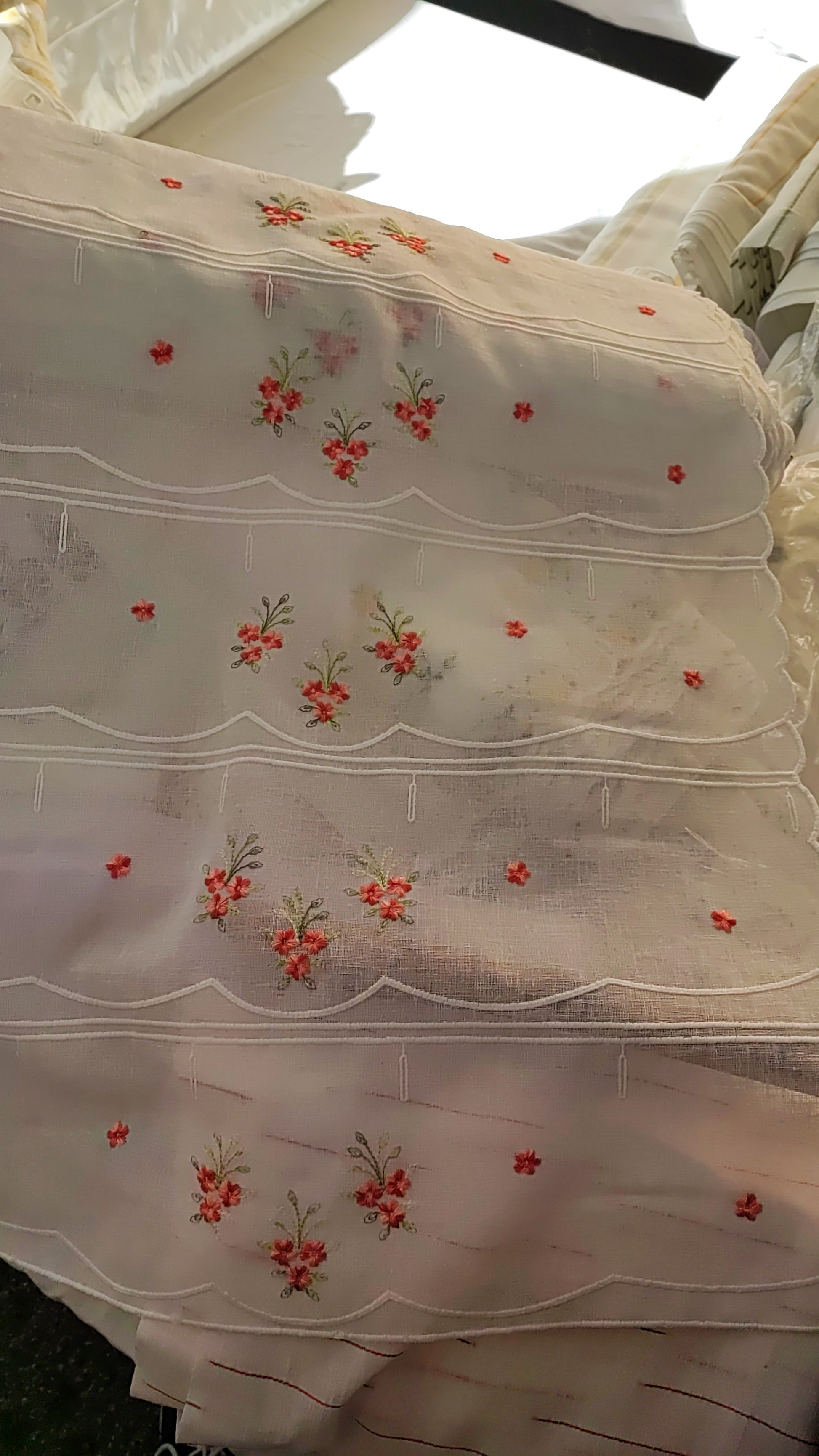 Tendina tessuto misto lino larga 60 cm taglio orizzontale già confezionata ricamata in rilievo con fiorellini, disegnata e prodotta in italia.
