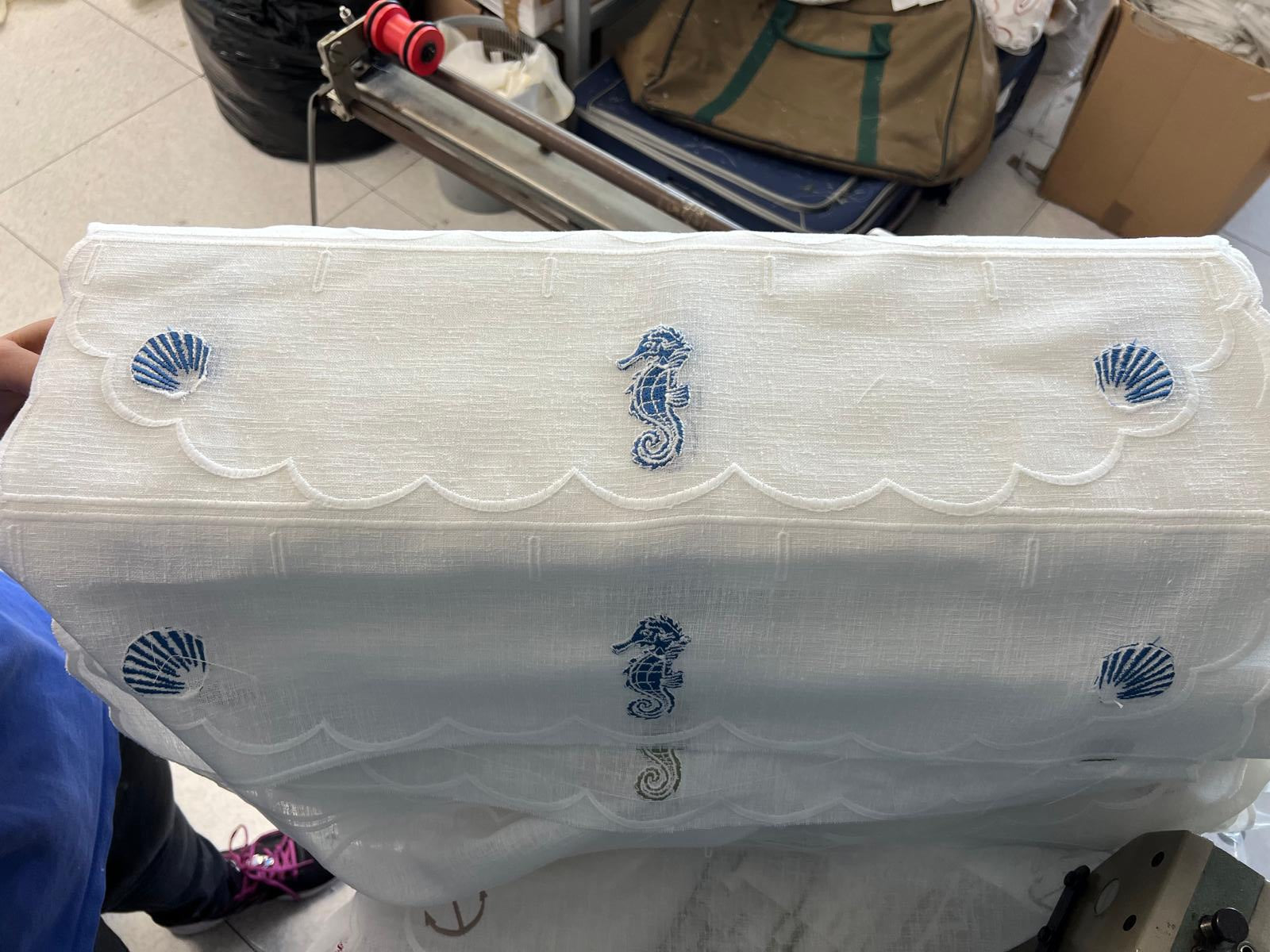 Tendina modulare ricamata produzione italiana non bisogna fare orli, noi si taglia, si spedisce ed il cliente la mette direttamente al vetro senza cucirla . Larga 60 cm come un vetro standard.