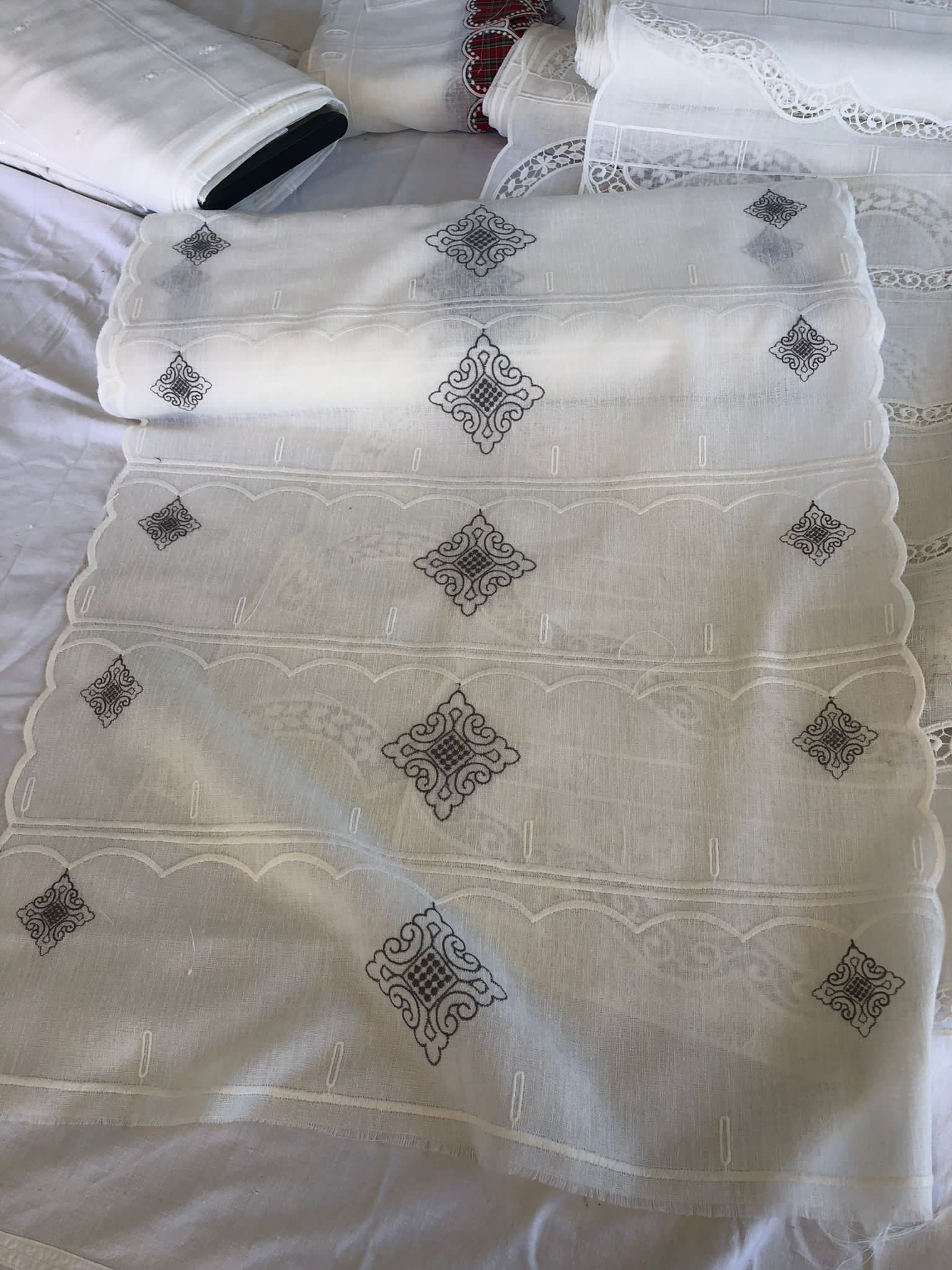 Tendina tessuto misto lino larga 60 cm taglio orizzontale già confezionata ricamata in rilievo con disegno geometrico prodotta in Italia.