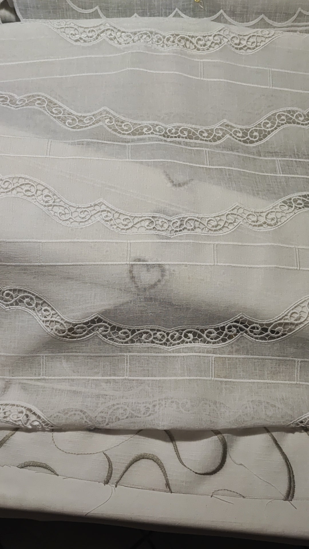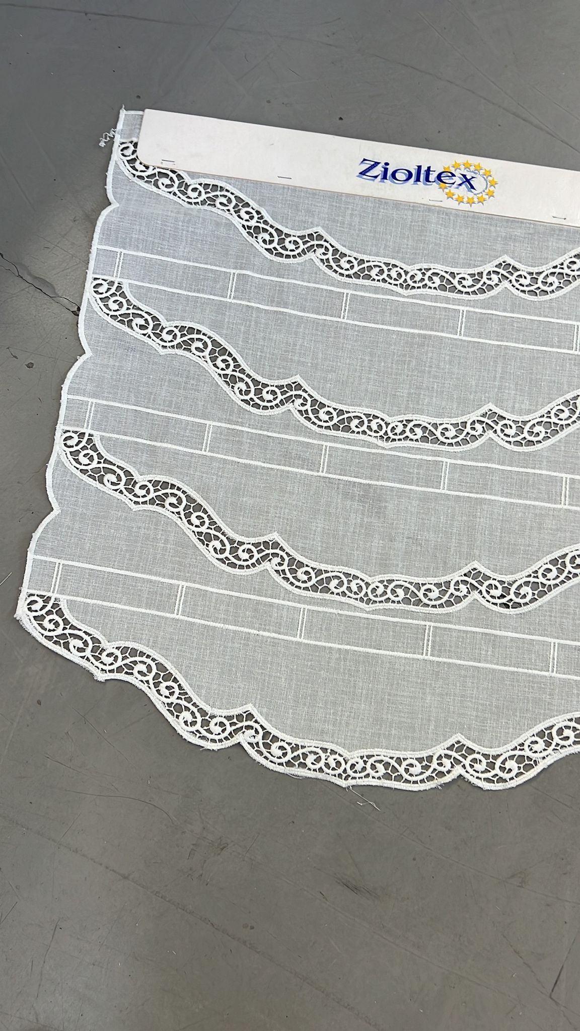 Tendina taglio orizzontale, misto lino con macramè, si può mettere nei vetri dai 40 ai 60 cm di larghezza. Nei vetri di 40 e 50 cm il tessuto viene leggermente movimentato.