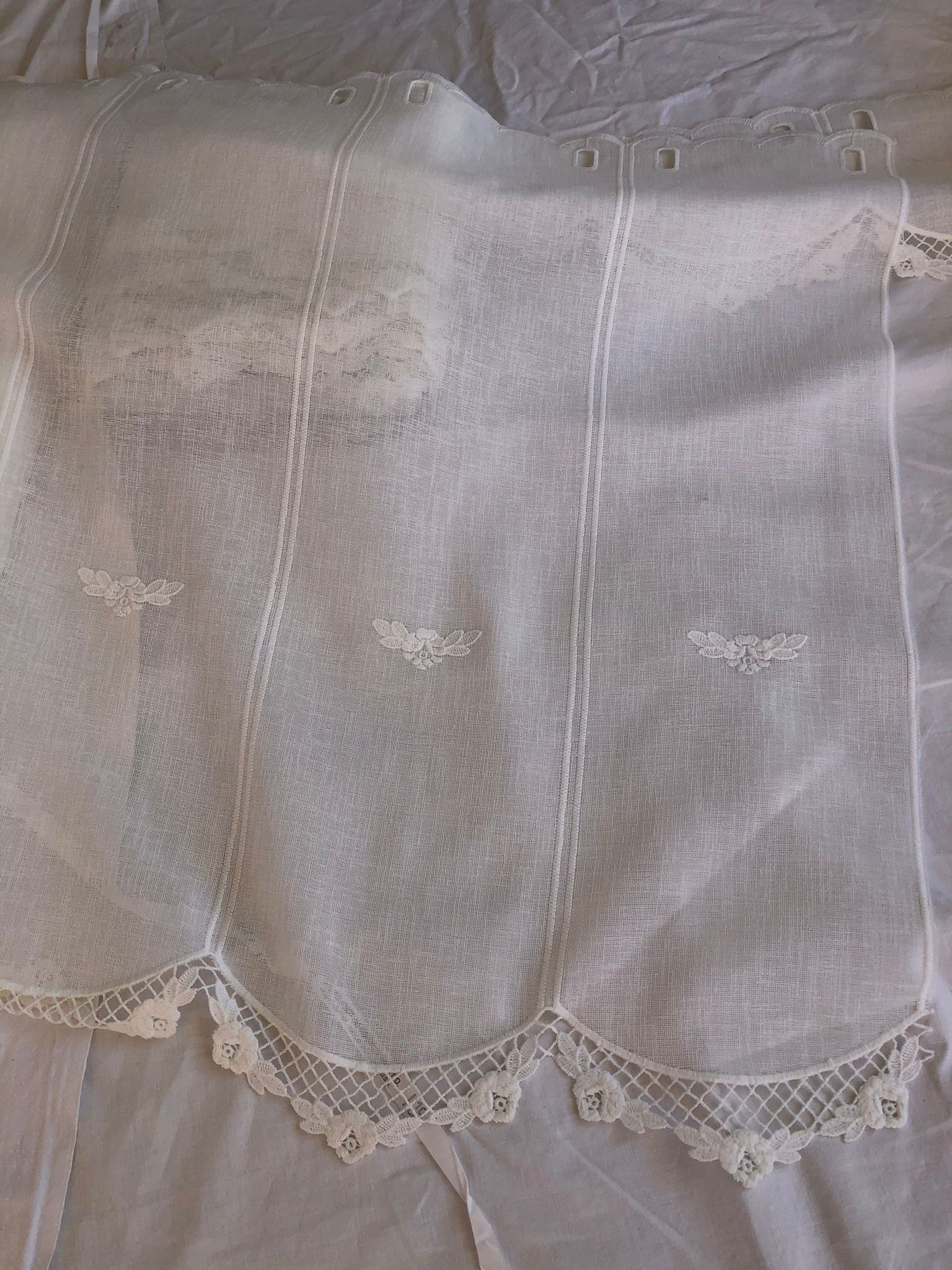Tendina tirolese taglio verticale a vetro alta cm 60 , 90 , 150 e 2.40 prodotta, disegnata e ricamata in Italia con macramè in fondo tinta unita