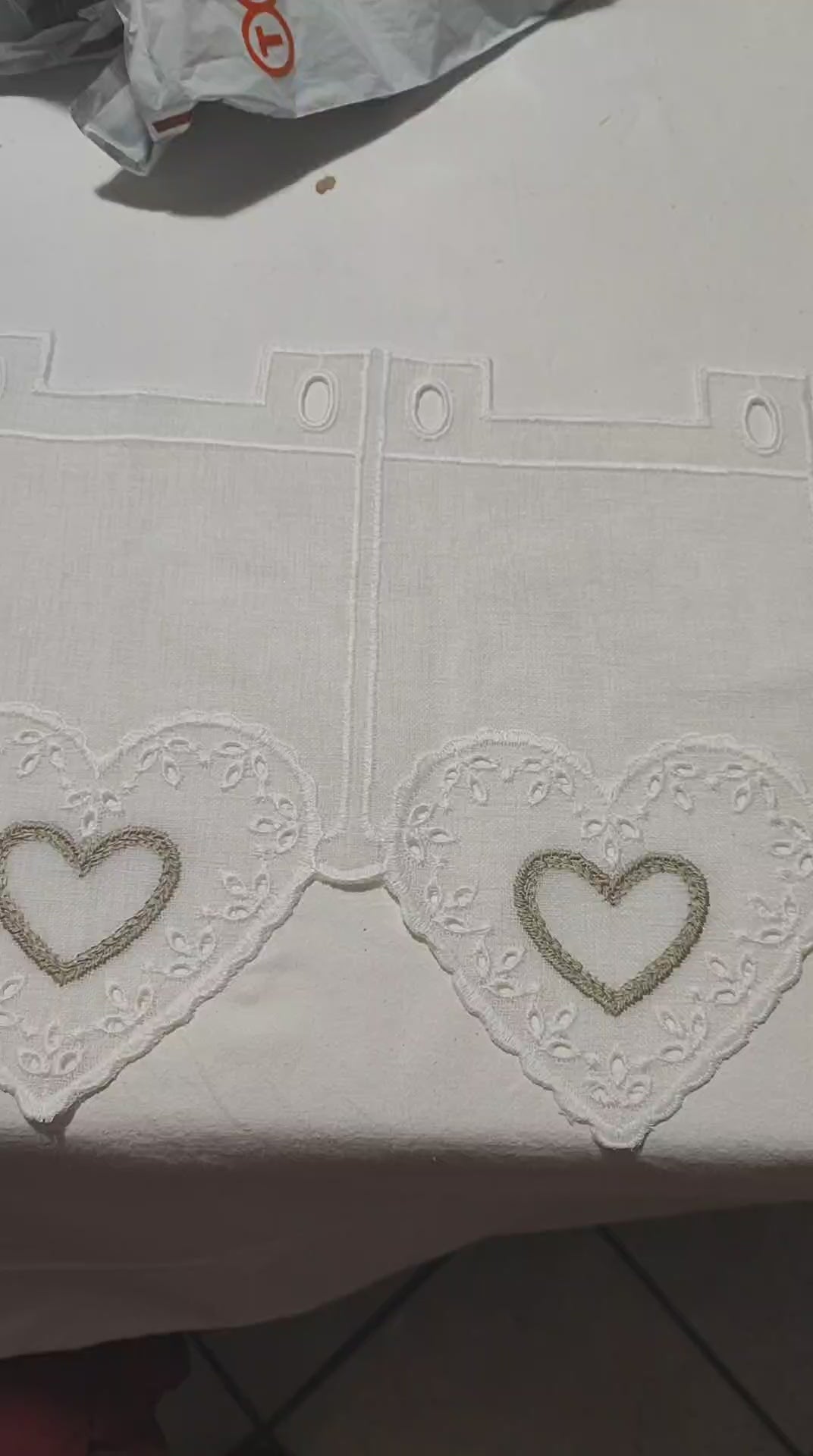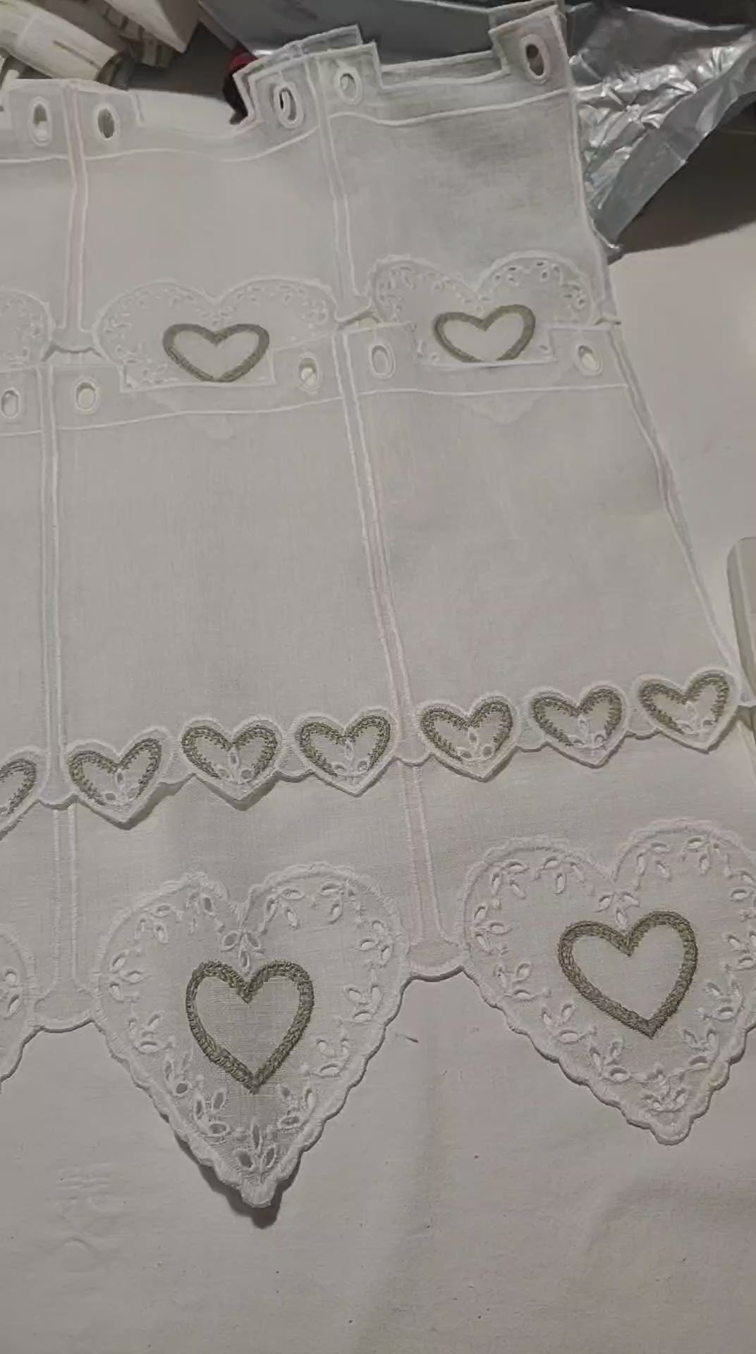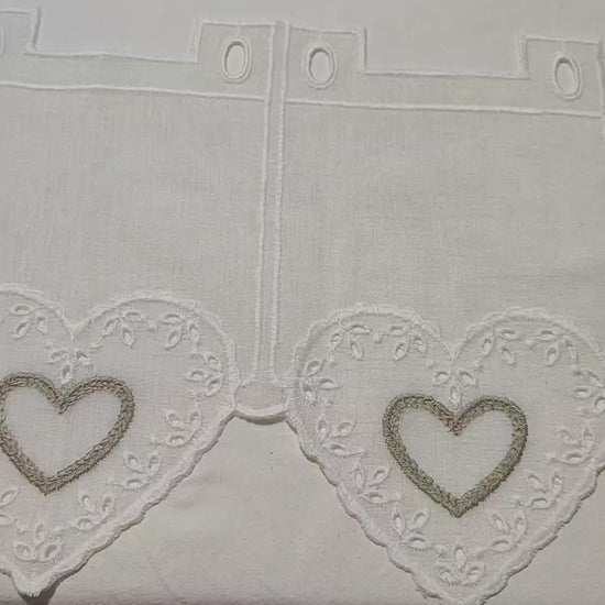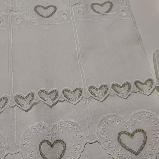 Tendina h 60 e mantovanina h 25 sia con cuore grande che con i tre cuori piccoli .Graziosa tenda in tessuto bianco, impreziosita da un romantico cuore in pizzo nella parte inferiore