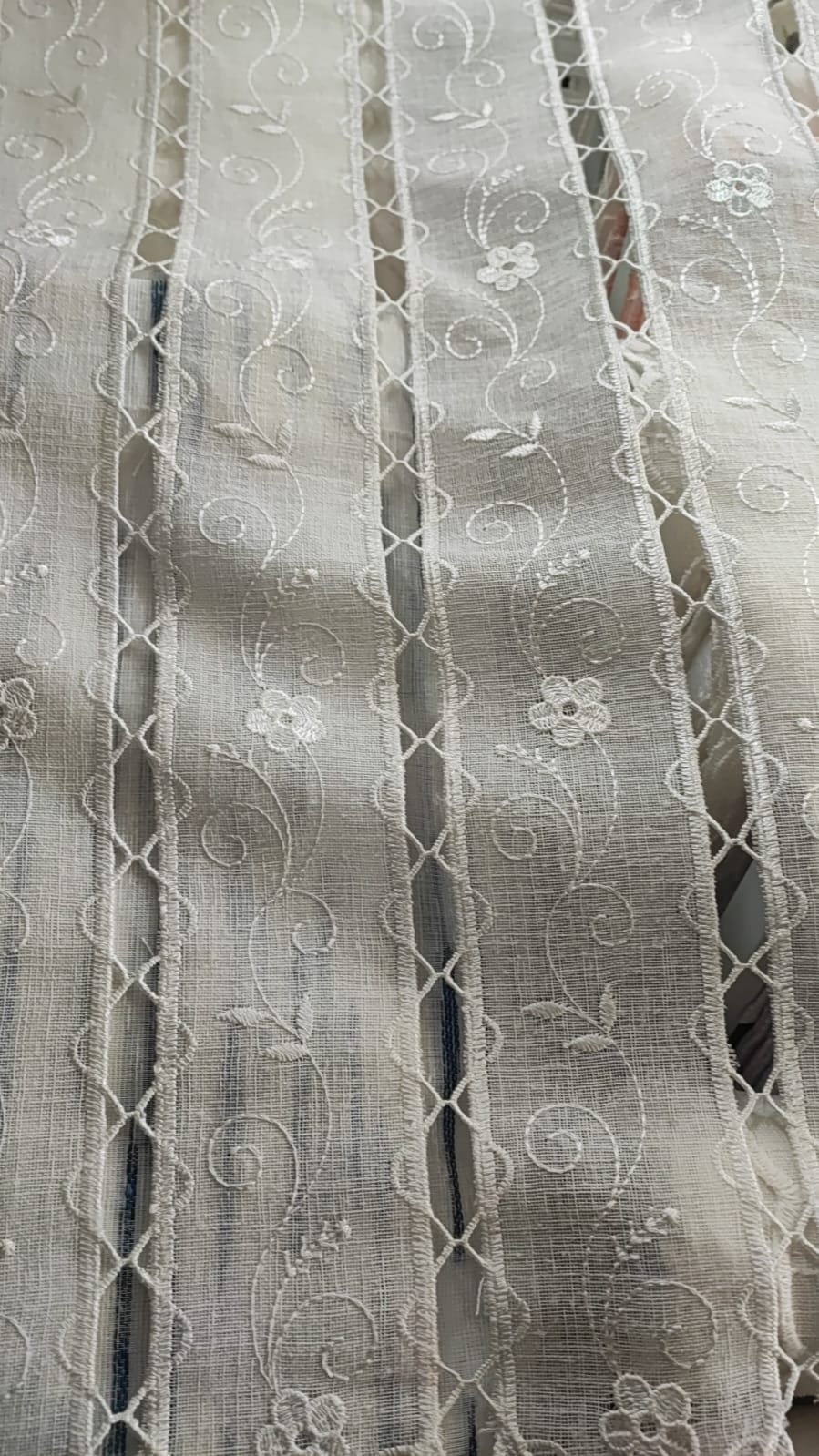 Tendina tirolese ricamata in rilievo e con macramè misto lino, produzione Italia.