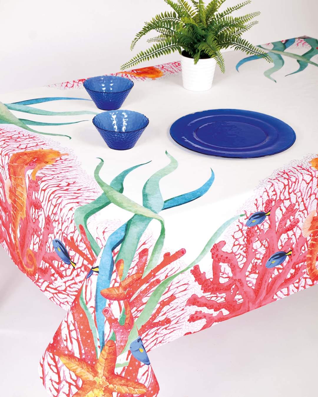 Tovaglia con corallo rosso, disegno digitale misura 150x230, progettata e disegnata in Italia.Puro cotone.