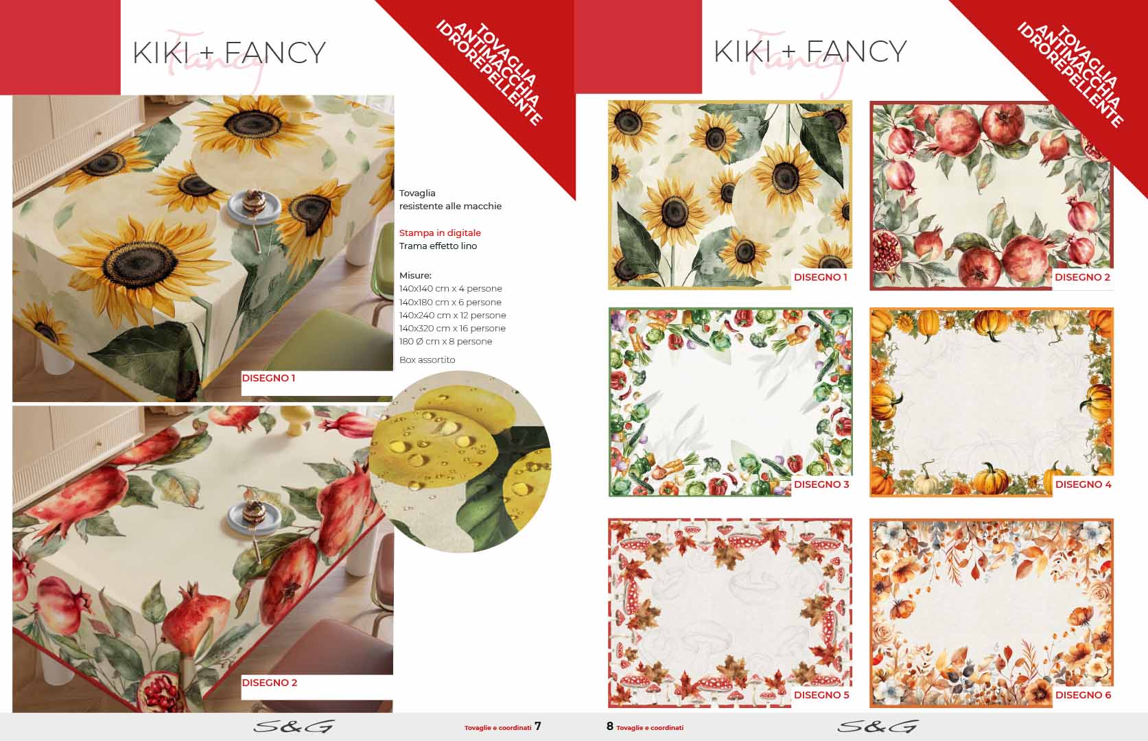 Tovaglia antimacchia disegno Kiki Fancy diversi disegni da Sghome, ottima azienda di biancheria per la casa. Tessuto 100% poliestere effetto lino, si pulisce facilmente con una spugnetta, stampe digitali molto belle, misure disponibili da 4,6 , 12, e rotonde diam 180 un prodotto vincente a un ottimo prezzo di vendita.