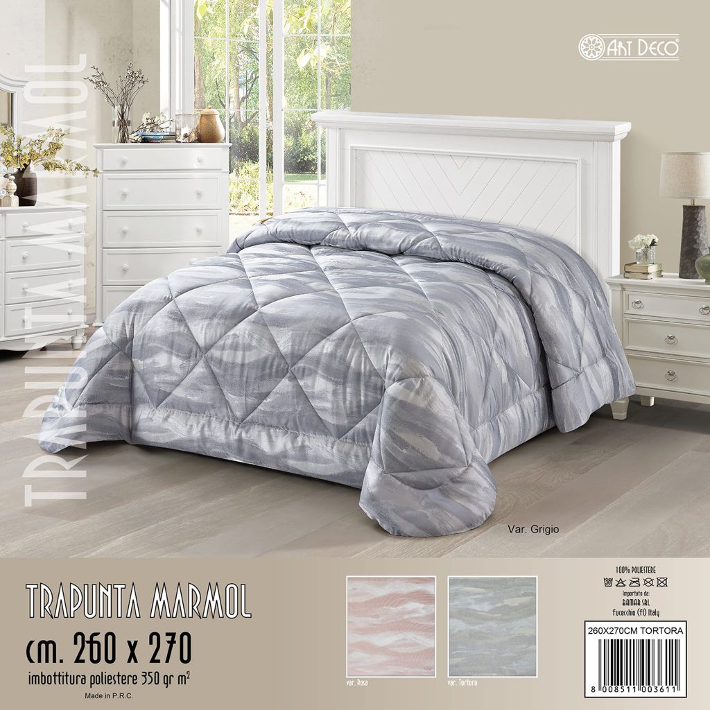 Trapunta marmoil matrimoniale 260.x270.Imbottitura microfibra 350 gr M2.Il sotto ha una fodera antiscivolo in maniera che non scivola sulle lenzuola.Pridotto di buon livello, soffice, calda ma non pesante.Disponibile color rosa sfumata.La Trapunta ha uno sconto del 50 % veniva euro 180.00 scontata euro 90.00 come potete vedere dal prezzo esposto.