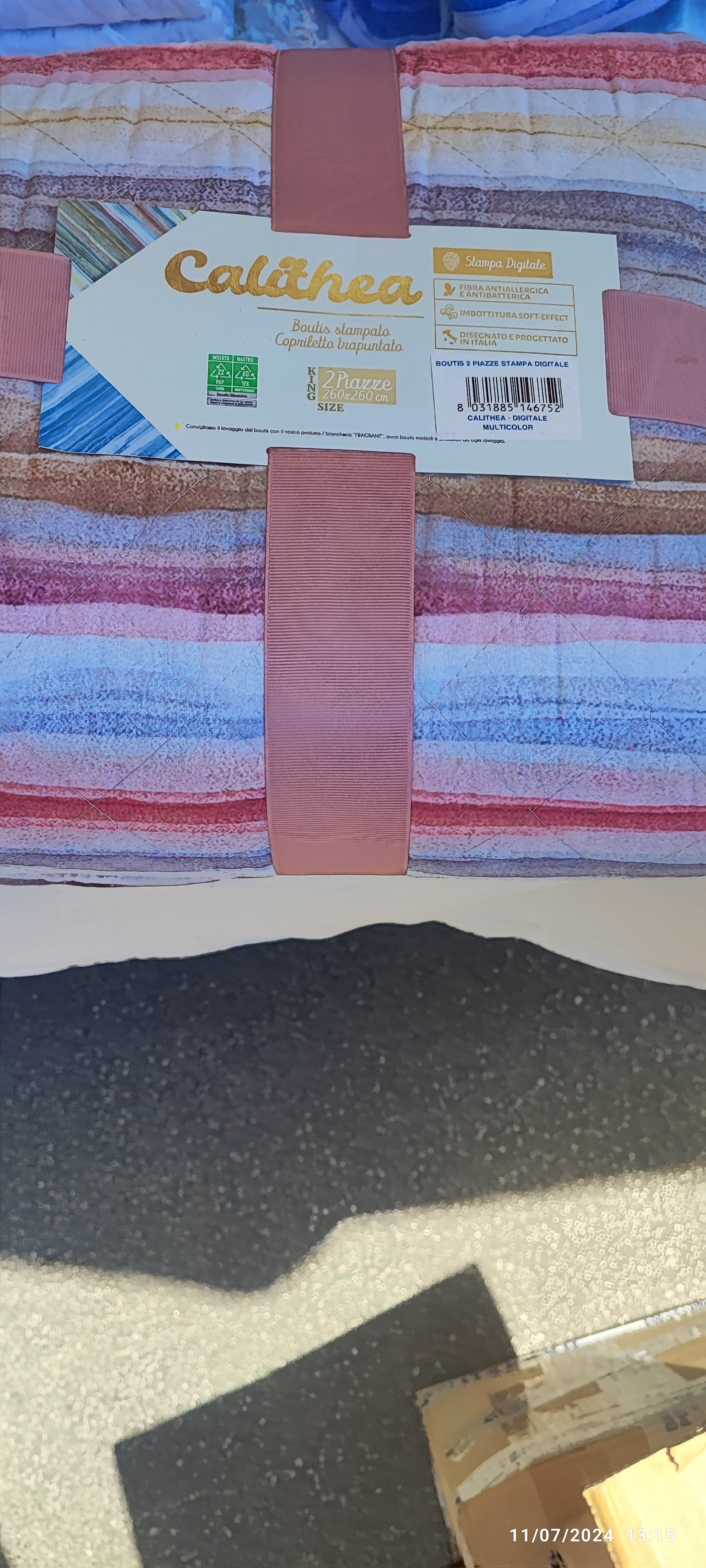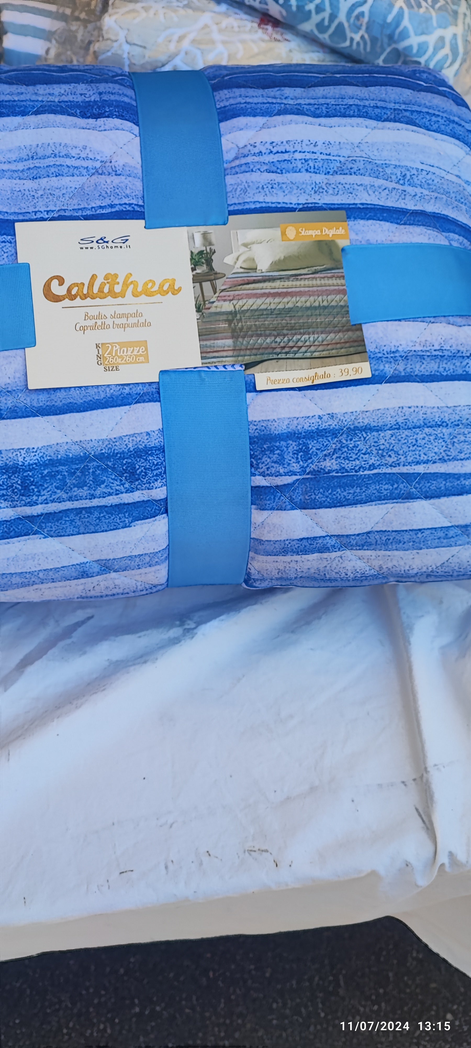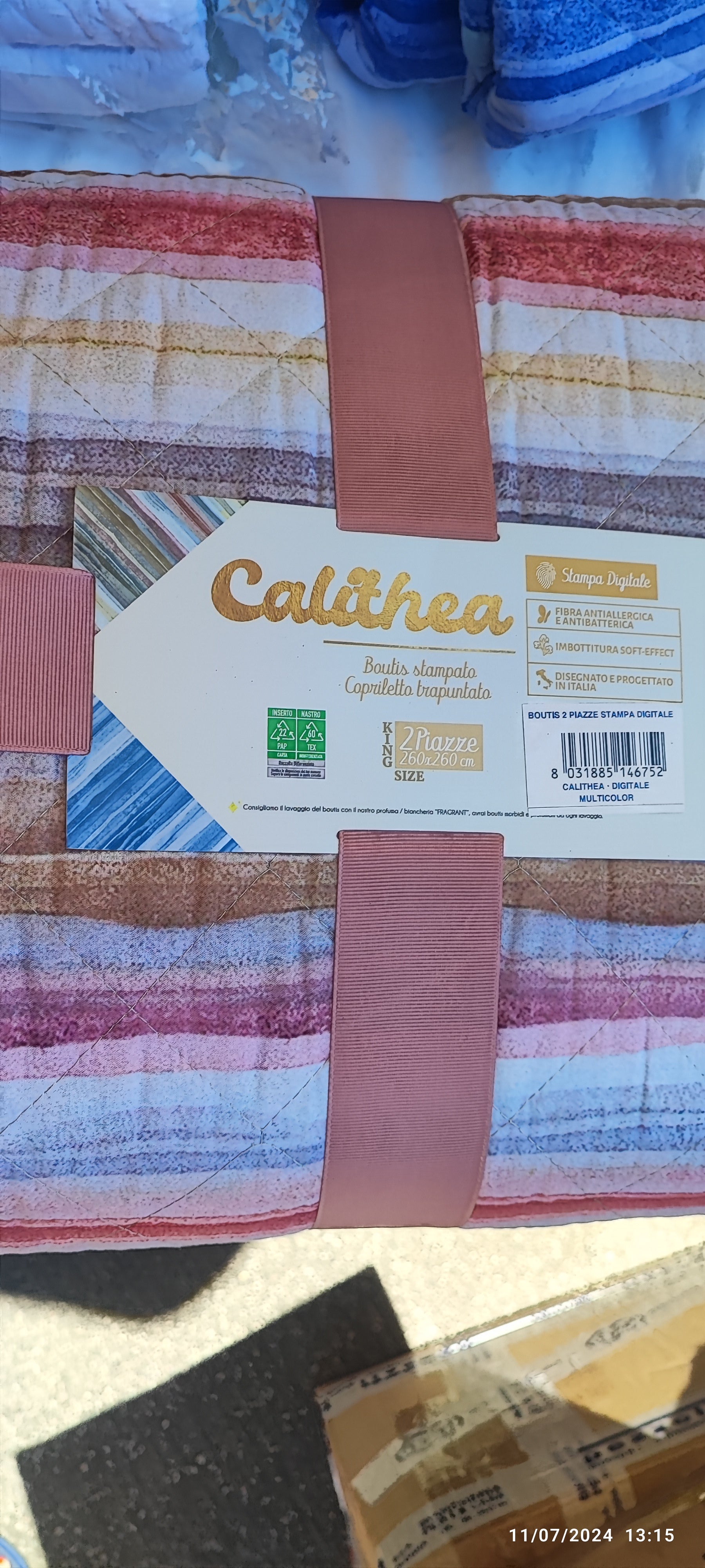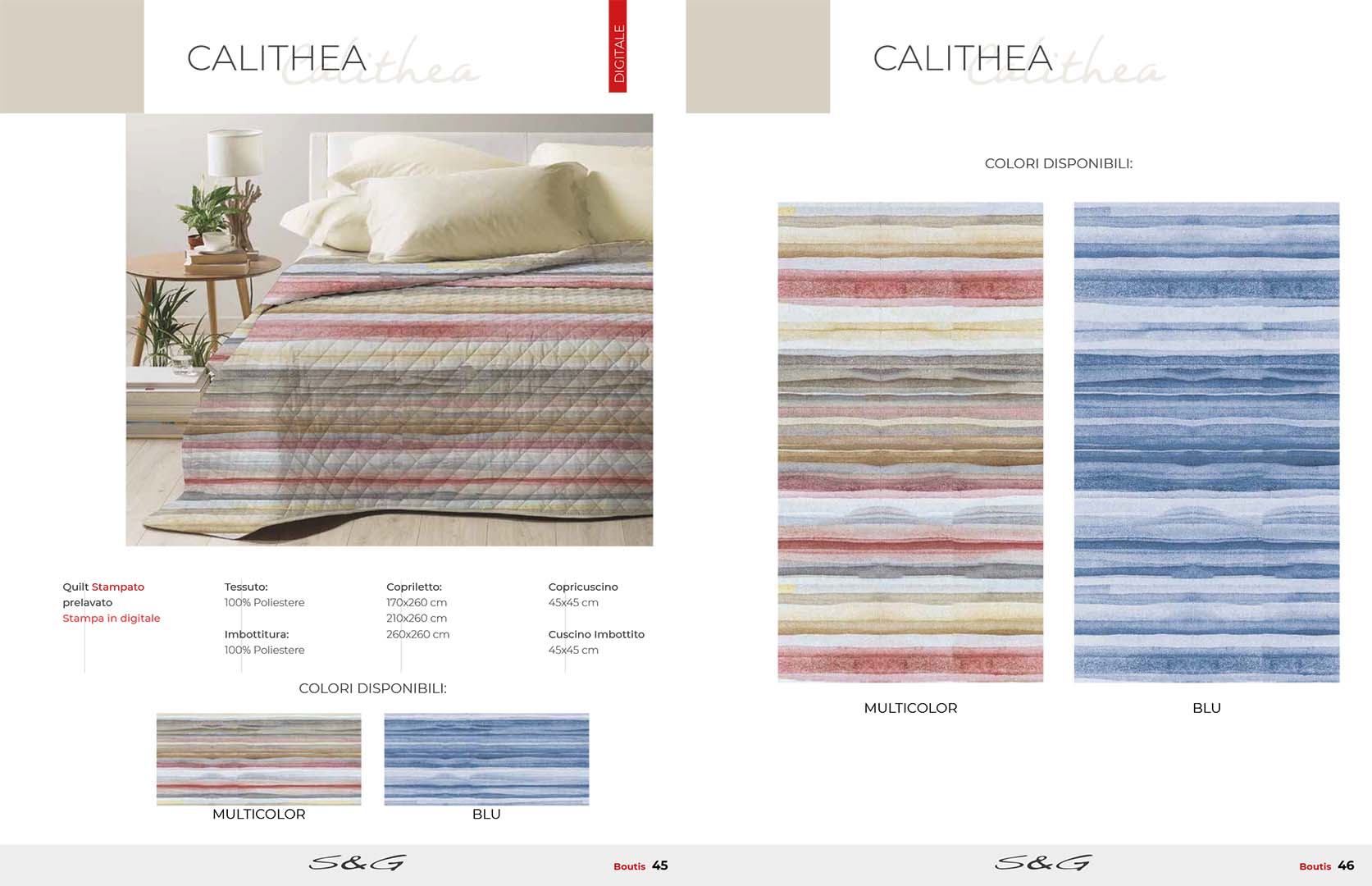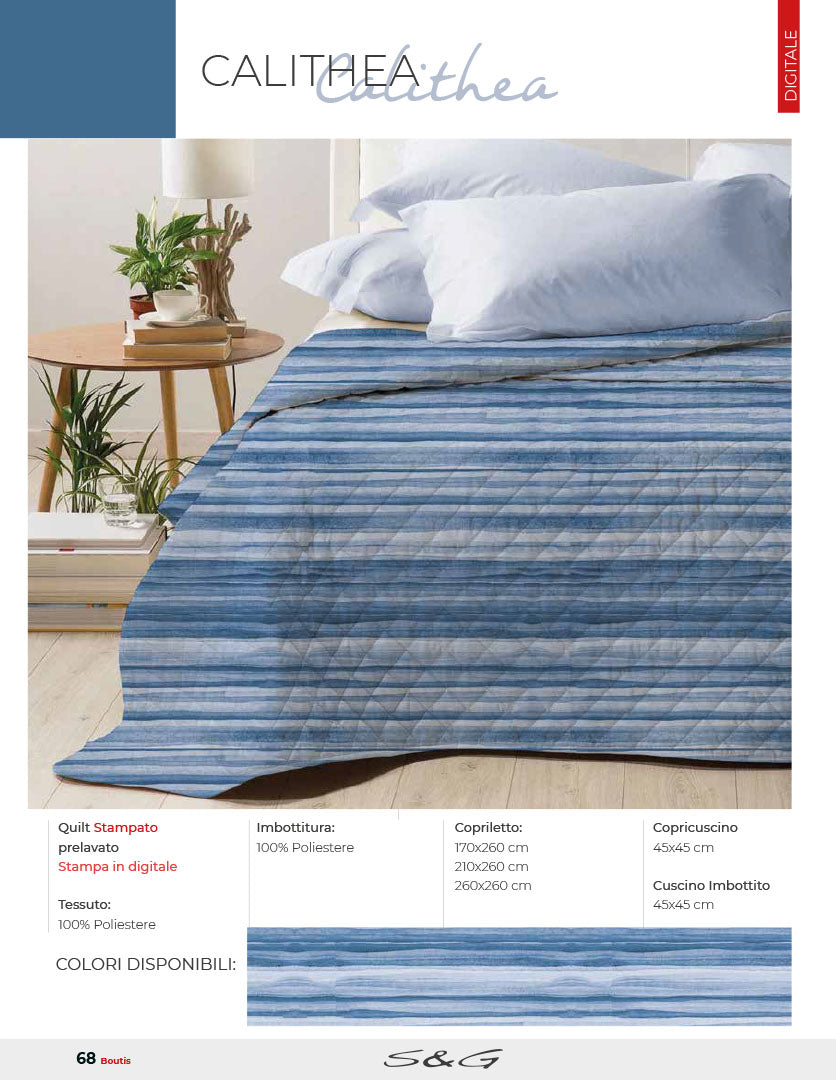 Trapuntino primavera / estate Calithea da SGhome. Tessuto esterno 80% Cotone 20% Poliestere e imbottitura in Poliestere 100 gr/mq, stampa digitale. Ottima qualità.